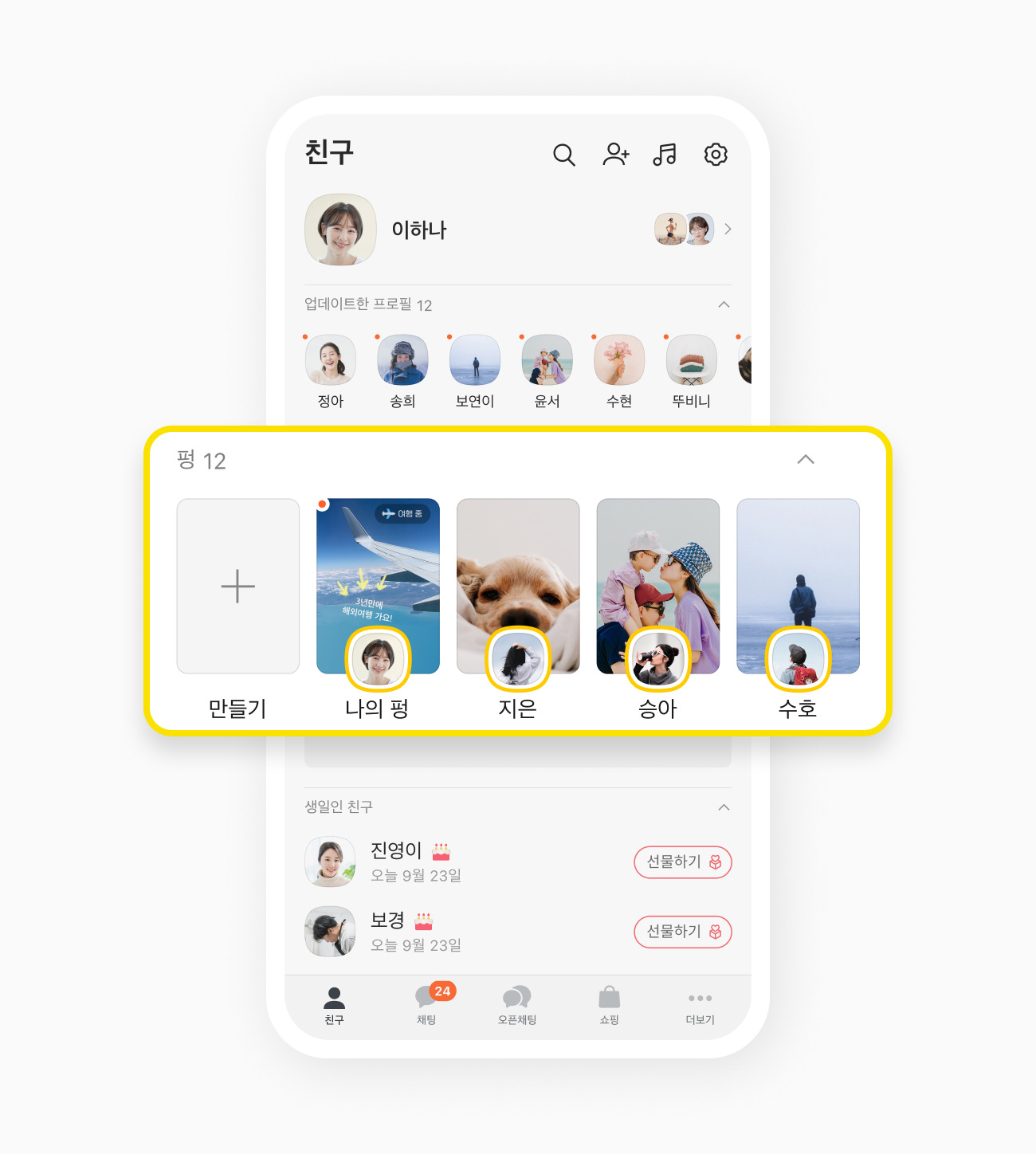 현재 카카오톡의 첫 탭은 친구 이름이 가나다순으로 나열된 방식입니다. 업데이트한 친구들의 프로필이 상단에 보이고 그 하단에 광고 배너가 배치된 구조입니다. 이 공간에서 이용자들이 탐색할 수 있는 것은 많지 않습니다. 생일인 친구를 확인해 보거나 프로필을 변경한 친구를 보는게 대부분이죠.