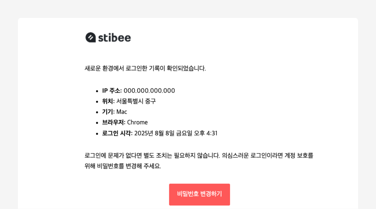 내 계정을 더 안심하고 사용할 수 있도록, 의심스러운 로그인이 감지되면 즉시 안내 이메일이 발송됩니다. 최근에 새로운 디바이스, 브라우저에서 스티비에 로그인해 보셨다면 이런 이메일을 받아보셨을 거에요. |