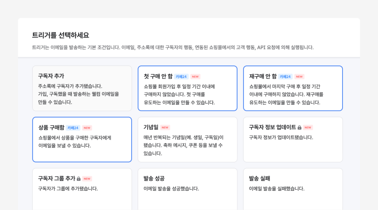 자동 이메일에 새로운 트리거가 추가됐습니다. 카페24 연동을 하신 경우, 쇼핑몰 고객의 구매 시점에 맞춰 이메일을 자동 발송할 수 있습니다.