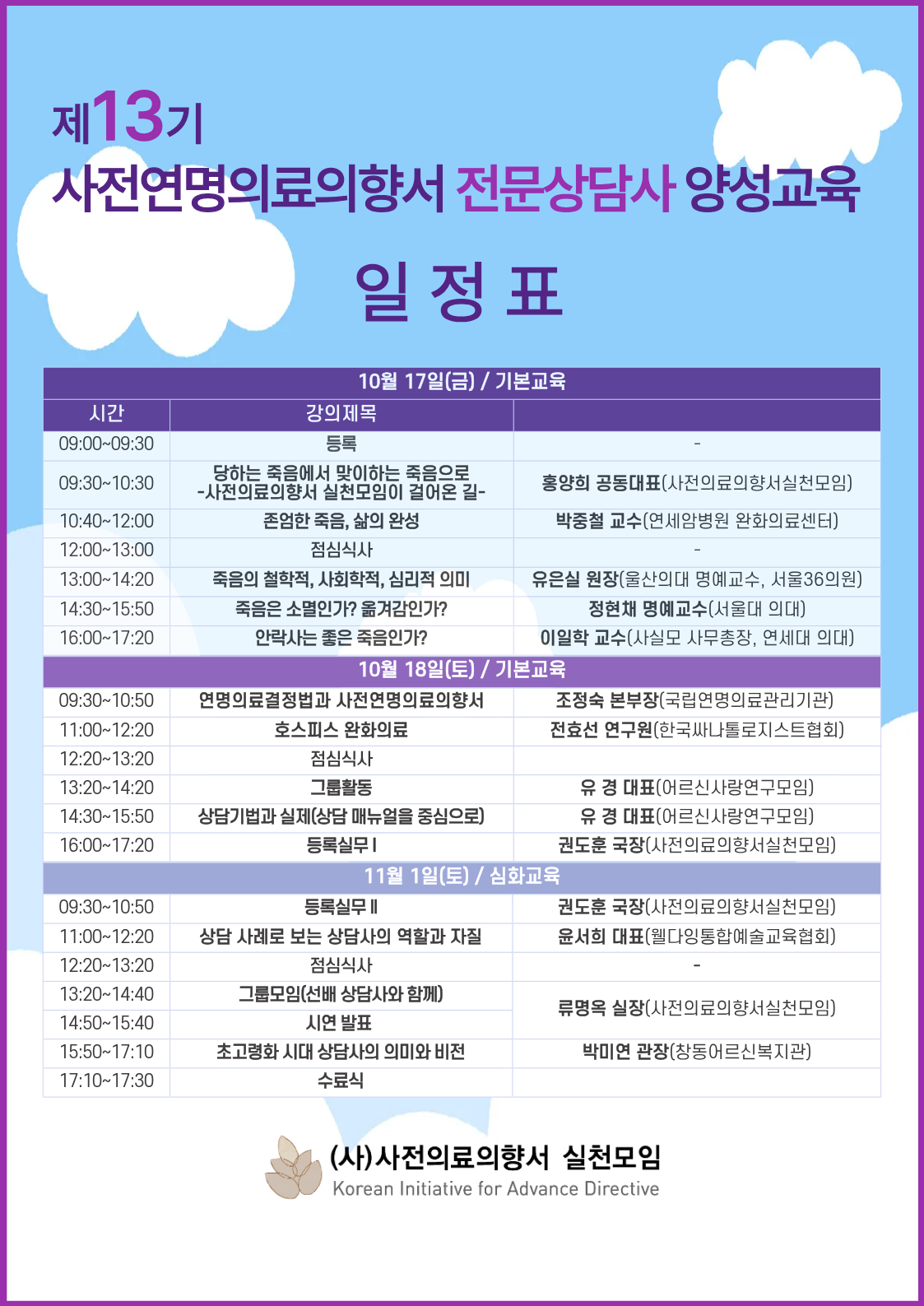 제13기 사전연명의료의향서 전문상담사 양성교육이 오는 10월 17일(금)부터 18일(토) 이틀간 기본교육으로, 이어 11월 1일(토)에는 심화교육으로 보문로 상담센터 강의실에서 진행됩니다.