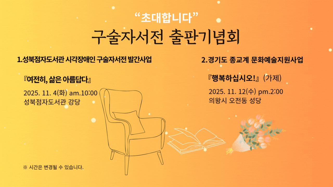 후원자 여러분께 감사의 뜻으로 구술자서전 『살아온 기적이 살아갈 기적이 되다』를 보내 드립니다. 이 책을 받기 원하시는 분은 사무국으로 주소를 보내 주시기 바랍니다. |
