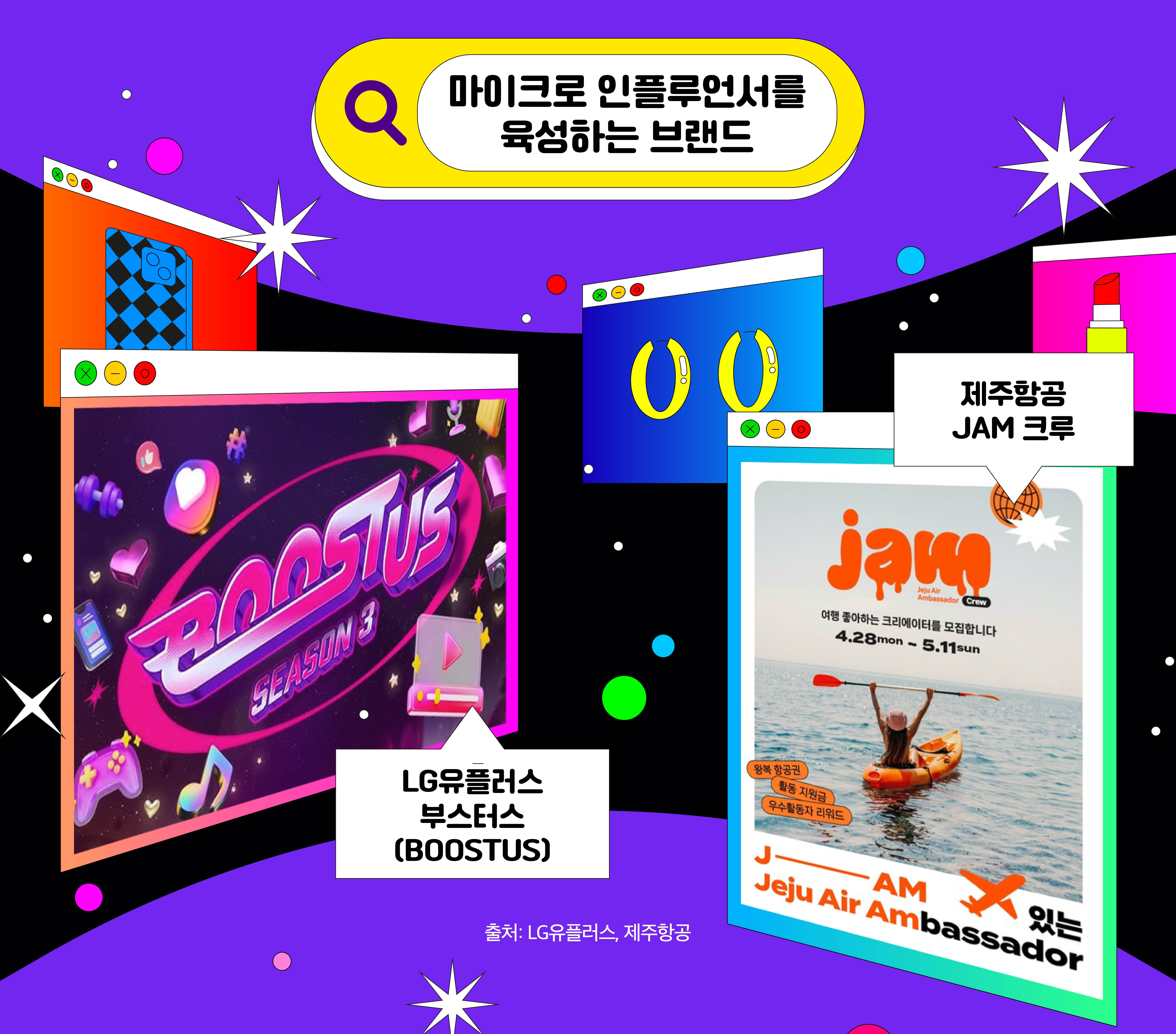 마이크로 인플루언서의 영향력이 높아지면서, 이들을 모집해 브랜드 홍보에 활용하거나, 직접 육성해 긍정적인 관계를 맺는 사례가 늘고 있습니다. LG유플러스는 2023년부터 크리에이터 육성 캠페인 ‘부스터스’를 운영하며, 브랜드의 찐팬으로 성장시키고 있습니다. 참여형 커뮤니티를 통해 소통을 강화하는 한편, 콘텐츠 제작자로서 성장할 수 있는 기회도 제공합니다. 제주항공은 여행 인플루언서 ‘JAM 크루’를 운영하고 있습니다. JAM 크루는 제주항공이 취항 중인 노선에서 즐길 수 있는 여행법을 발굴하고, 다양한 부가서비스 이용 팁을 자신만의 방식으로 소개합니다.
