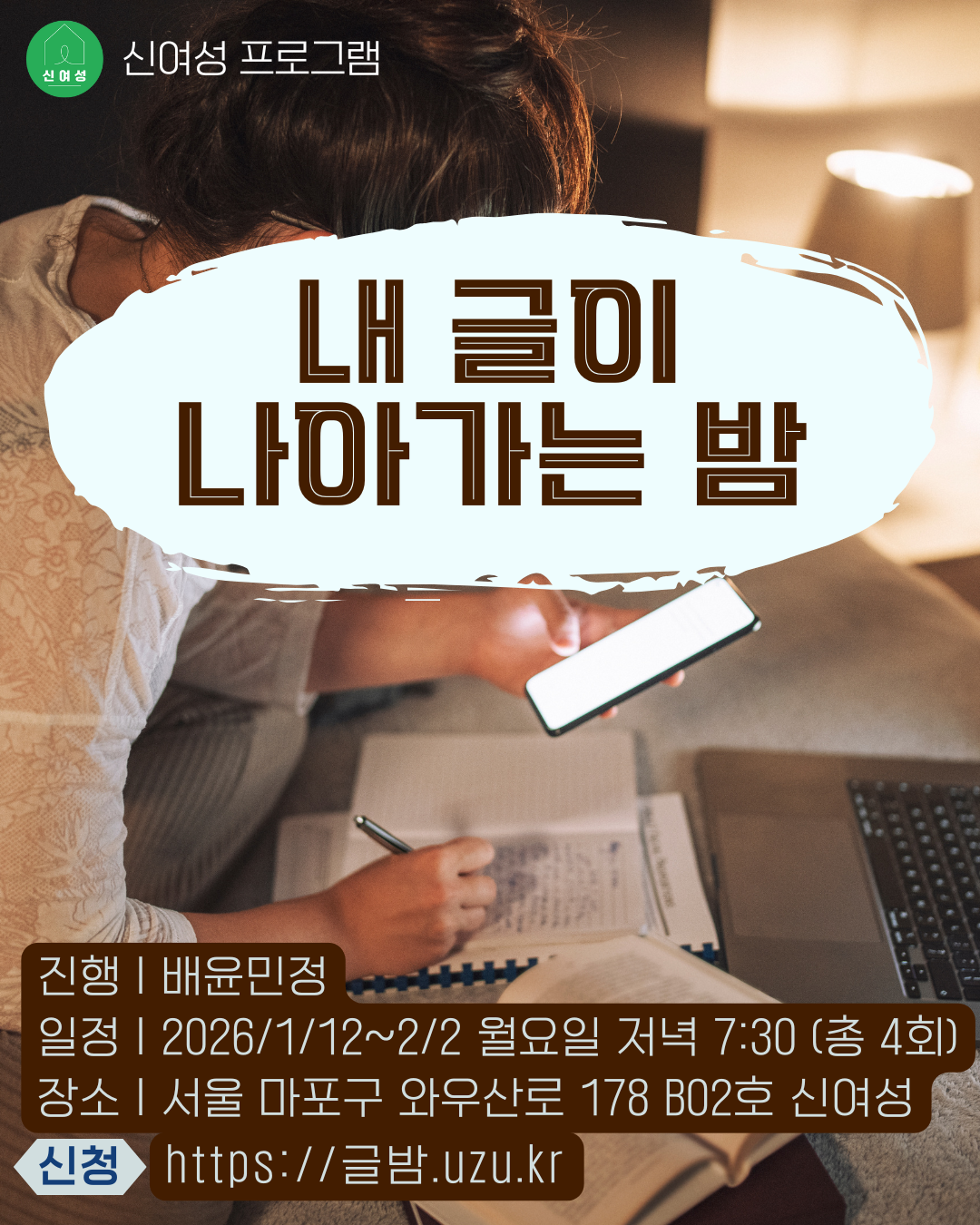 한 시간 동안 세상의 소음을 끄고 글만 쓰는 모임 <내 글이 나아가는 밤> 등이 열립니다 새해에 글 쓰는 사람으로 머무를 수 있는 시간이 필요하다면 신여성으로 오세요.