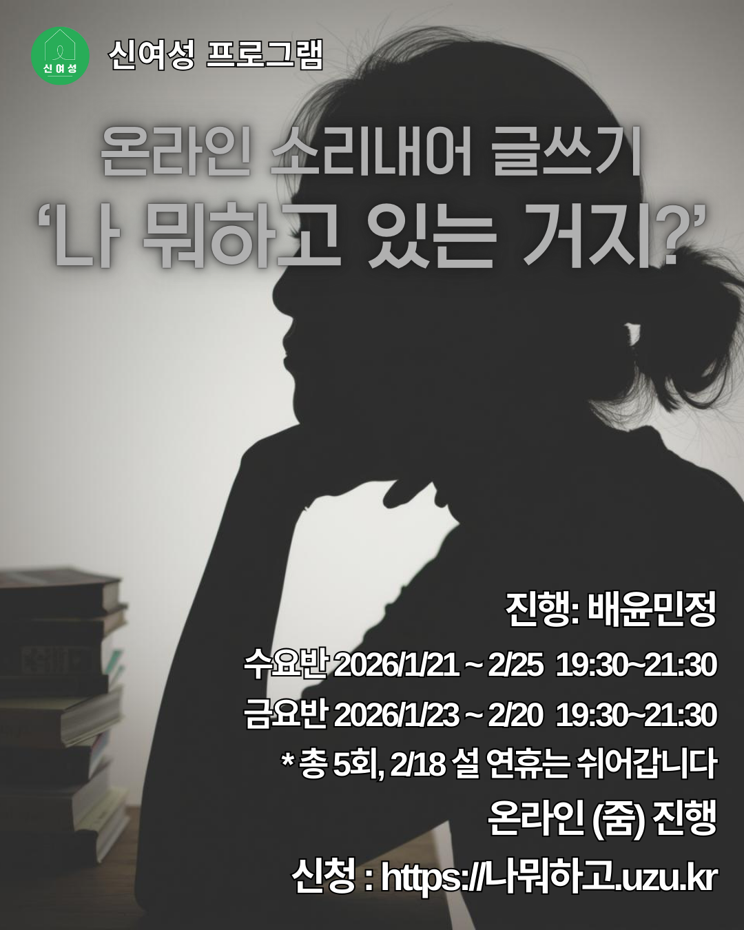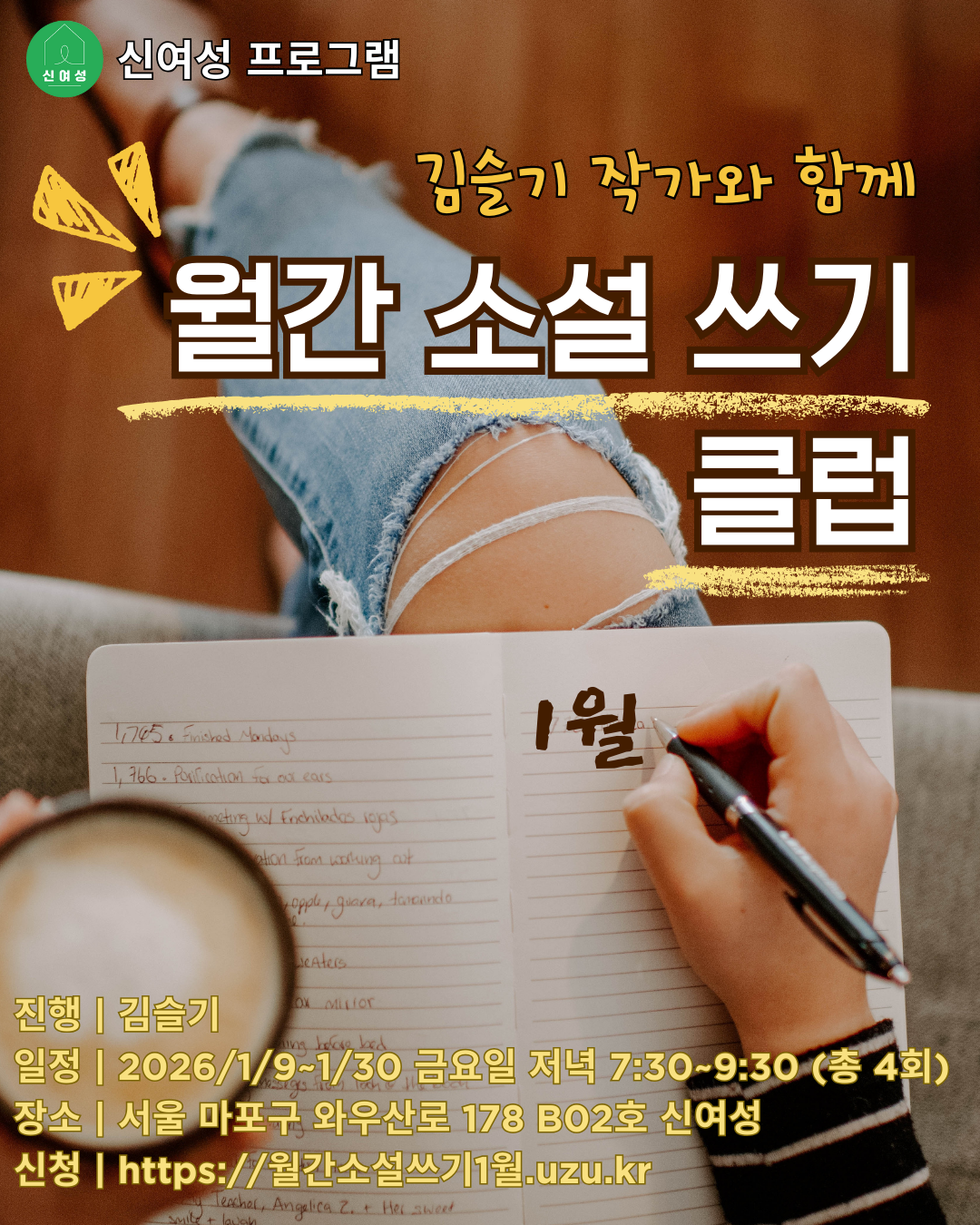 한 시간 동안 세상의 소음을 끄고 글만 쓰는 모임 <내 글이 나아가는 밤> 도파민 터지는 소설 쓰기 <월간 소설 쓰기 클럽> 온라인으로 서로의 마음을 살피는 <온라인 소리내어 글쓰기 - 나 뭐하고 있지?> 가 열립니다. 신여성 책상에서 조용히 작업하실 분도 모집 중이에요.