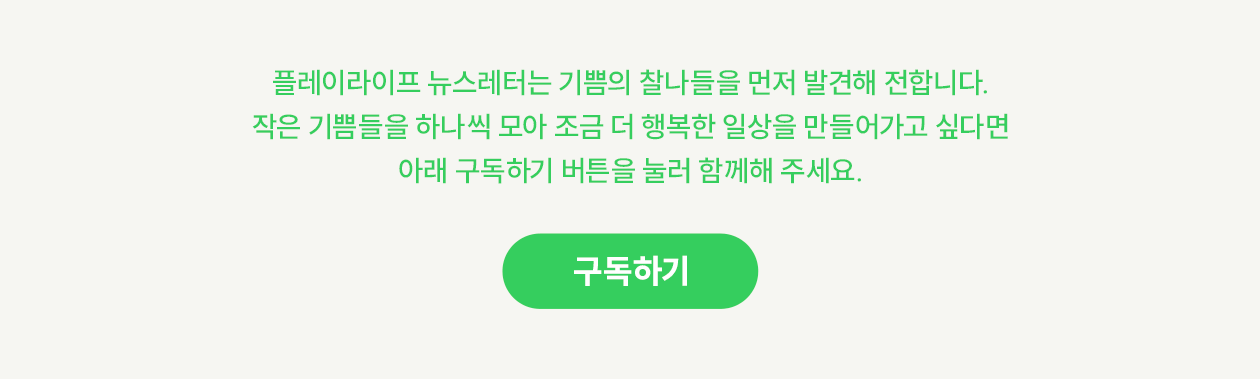 올해 플레이라이프 뉴스레터는 에디터가 일상에서 수집한 기쁨을 소개합니다. 올해 플레이라이프 뉴스레터는 에디터가 일상에서 수집한 기쁨을 소개합니다. 아주 사소하지만, 우리의 하루를 조금 다르게 만들어주는 순간들. 식물에 물을 주는 시간, 좋아하는 음악 앞에 잠시 멈춰 서는 일, 괜히 마음이 가벼워지는 장면들 말이에요. 플레이라이프는 그런 기쁨들을 먼저 발견해 전하고, 이 뉴스레터를 읽는 여러분도 각자의 일상에서 기쁨을 발견해 보기를 조심스럽게 건넬 예정입니다. 앞으로의 이야기를 함께 지켜봐 주세요! |