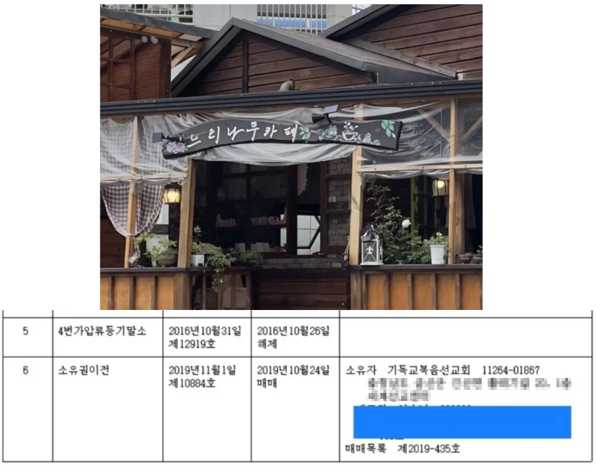 관련 이슈가 일파만파 퍼지고, 더욱 심층적으로 조사를 한 결과 충격적인 사실이 밝혀졌다. 해당 카페에는 ‘JMS’의 교주 정명석의 친필로 쓰인 간판이 걸려있었고, 등기부등본을 떼어본 결과 소유자는 기독교복음선교회. 즉, ‘JMS’ 단체 소유 건물이었다. |