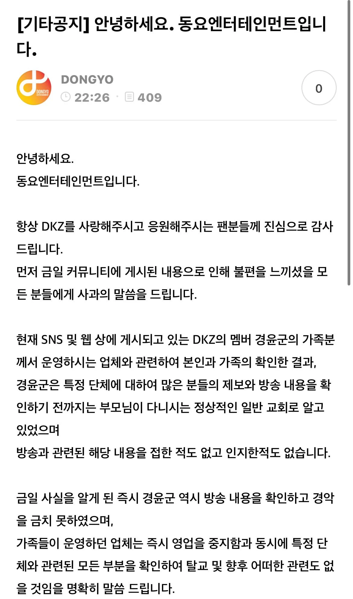 "사실을 알게 된 즉시 경윤 군 역시 방송 내용을 확인하고 경악을 금치 못하였으며, 가족들이 운영하던 업체는 즉시 영업을 중지함과 동시에 특정 단체와 관련된 모든 부분을 확인하여 탈교 및 향후 어떠한 관련도 없을 것임을 명확히 말씀드린다.”
