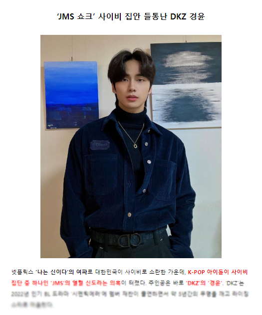 넷플릭스 ‘나는 신이다’의 여파로 대한민국이 사이비로 소란한 가운데, K-POP 아이돌이 사이비 집단 중 하나인 ‘JMS’의 열혈 신도라는 의혹이 터졌다. 주인공은 바로 ‘DKZ’의 ‘경윤’. ‘DKZ’는 2022년 인기 BL 드라마 ‘시멘틱에러’에 멤버 재찬이 출연하면서 약 3년간의 무명을 깨고 라이징 스타로 떠올랐다. |
