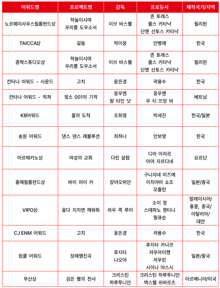 수상작들은 사회적 불평등, 젠더, 전쟁과 국경, 가족애 등 동시대적 주제를 깊이 있게 조명하며 다양한 장르적 실험을 선보였다. 그 가운데 전작을 통해 연출력을 인정받은 신진 감독과 프로듀서들의 프로젝트가 두각을 드러냈고, 국제 공동제작으로 완성도를 높인 작품들이 큰 주목을 받았다. 한국에서는 2부문의 영광을 차지한 <고치>(윤은경)를 비롯해 <길동>(박이웅), <물의 도착>(조희영), <댄스 댄스 레볼루션>(최하나) 등이 수상하며 장르성과 대중성을 두루 갖춘 독립영화 프로젝트들의 활약을 증명했고, 아시아에서는 베트남, 요르단, 필리핀 등 다양한 지역의 창작자들이 수상의 영예를 안았다.