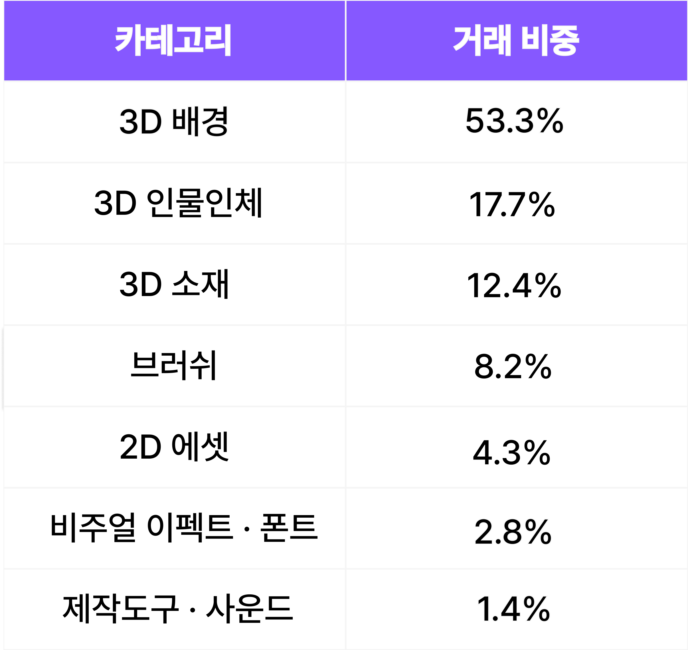 3D 배경(🔺8.1%) 3D 소재(🔺8.4%) 2D 에셋(🔺11.9%) 비주얼 이펙트 / 폰트(🔺5.5%)