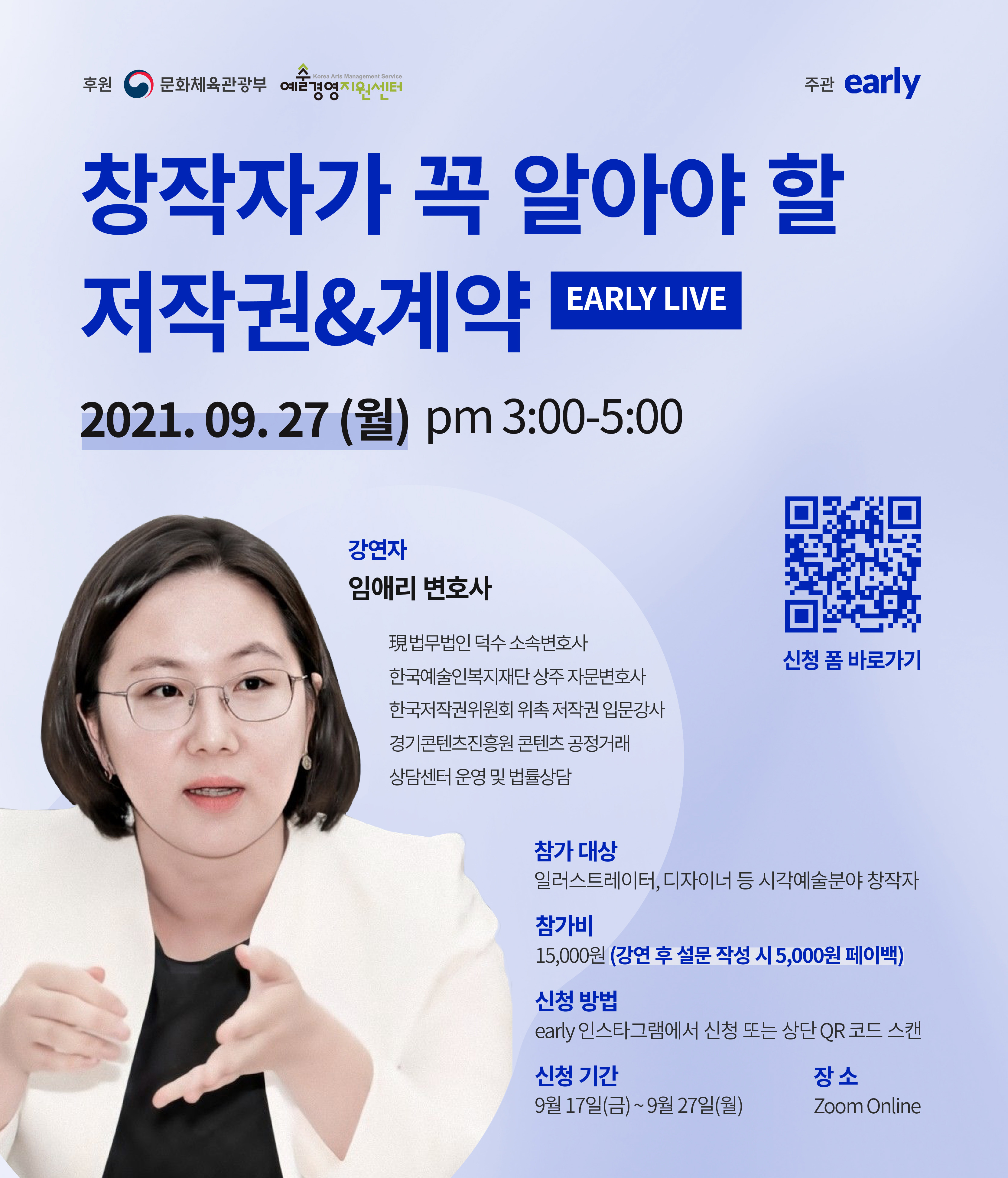 ☎저작권 법률 상담 : 1800-5455 03. 저작권 TV 한국저작권위원회 공식 유튜브 채널로, 딱딱할 것만 같은 공공기관 인식과는 다르게... 생각보다 실생활에 유용한 저작권 상식을 쉬운 영상으로 풀어 설명해준다는 점이 좋았어요. 04. 쉽게 읽을 수 있는 저작권 도서 추천 📗 된다! 유튜브·SNS·콘텐츠 저작권 문제 해결 (2020, 이지스퍼블리싱, 오승종 저) 이 책은 25년간 저작권을 다뤄온 판사 출신 변호사가 정리한 저작권 실무 답변 108가지를 정리한 책이에요. 최근에 발행된만큼, 요즘 콘텐츠 창작자가 겪을만한 최신 사례가 많이 담겨 있어 추천드리고자 해요! 📕 웹툰 작가에게 변호사 친구가 생겼다 (2020, 바다출판사, 윤영환 외 3명 저) 웹툰 분야 창작업을 꿈꾸거나, 현업에 종사하고 있는 분들이 꼭 읽어봤으면 하는 책이에요. 계약서의 용어와 표현에 약하고, 자신에게 불리한 조항이 있어도 섣불리 이야기하지 못하는 초보 작가들이 계약서에 사인하기 전, 웹툰을 그리며 꼭 알아야 할 것들을 한 권에 모아 정리했다고 합니다! 05. 💙얼리 저작권 웨비나 개최 소식💙 아무리 좋은 콘텐츠가 많아도, 간접적인 경험들로는 해결이 되지 않는 부분들이 분명히 있죠. early는 당장, 어떻게 내 작업물을 지킬 수 있을지 걱정이 앞서는 창작자의 고민을 덜고자 오는 27일 월요일에 <웹툰 작가에게 변호사 친구가 생겼다>의 저자 임애리 변호사님과 함께 '저작권&계약 웨비나'를 진행하게 되었답니다! (책 뒷광고 절대 아님!) 관심 있으신 분들은 early 인스타그램 계정에서 웨비나 소식을 확인 후 신청해 주세요. 웨비나에 대해 더 궁금하실 구독자님을 위해, 아래로는 early 웨비나의 포스터 및 신청 양식을 전해드려요. (+) 지난주에 도착한 <소만 작가의 편지>에 대한 답장 '일부'를 전합니다🌹 - 시각디자인과를 지망하는 고등학생이에요. 요즘 입시를 하면서 ‘내가 정말 그림을 좋아하는게 맞을까?’ 하는 생각이 자주 들었는데, 작가님의 인터뷰를 읽고 저도 저만이 그려낼 수 있는 세계를 그림에 담아보려고 해요. ☘️ - 안녕하세요 작가님😊 오늘따라 유난히 공감가는 작가님의 편지를 받게 되어 처음으로 답장을 써봅니다. 요즘 저는 제 모든 상황이 작가님이 말씀하신 것처럼 성공률이 희박한 게임을 하고 있는 것 같다는 생각이 들어요. 다들 ‘그저 그렇게'살지만, 정말 최선을 다했다가, 그저 그렇다가, 또 최선을 다하는 과정이라는 걸 요즘 들어 배우고 있고, 저도 그저 그런 삶에 불안하지 않으려고 노력하려고요!