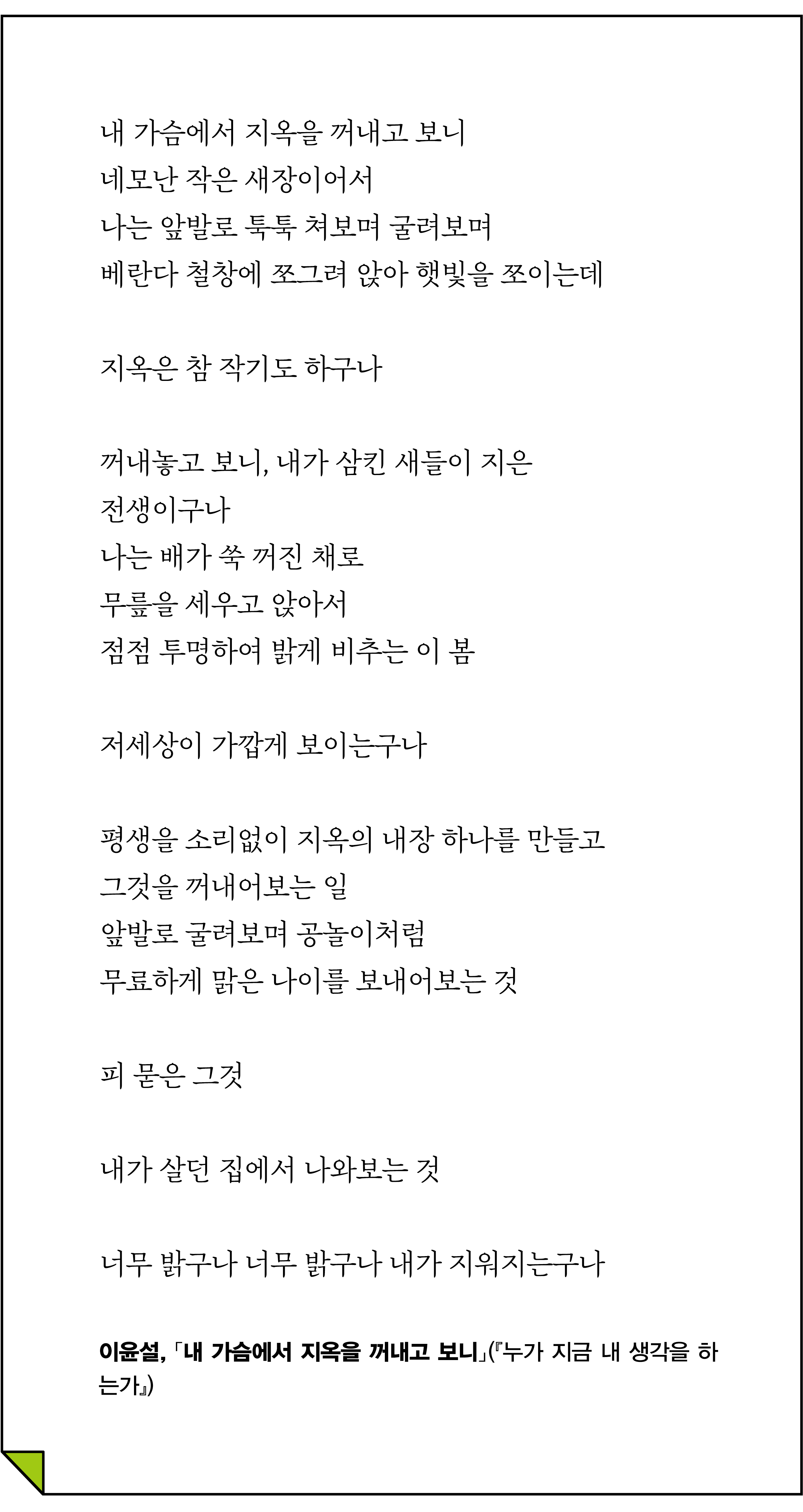 우리는 모두 가슴에 지옥 하나씩을 품은 채 살아가고 있습니다. “평생을 소리없이 지옥의 내장 하나를 만”드는 게 삶이라고 했던 시인의 말처럼. 불타는 집을 내면에 품고 “앗, 뜨거워. 앗, 뜨거워” 비명을 지르면서도 그 불타는 집에서 나올 생각은 하지 않지요. 그런 우리에게 이 시는 가슴에서 지옥을 꺼내 찬찬히 들여다보라고 합니다. 막상 꺼내서 보면 그 지옥이 “네모난 작은 새장”처럼 참 작다고. 나를 가두고 있다고 여겼던 것들이 실은 “내가 삼킨 새들이 지은/ 전생” 같은 것이라고 이야기하지요. 시적 화자는 그 ‘작은 지옥’을 공놀이하듯 “앞발로 툭툭 쳐보며 굴려보”기도 합니다. 자신이 살던 고통의 집에서 나와보는 것만으로도 그 무게는 훨씬 줄어들지요.