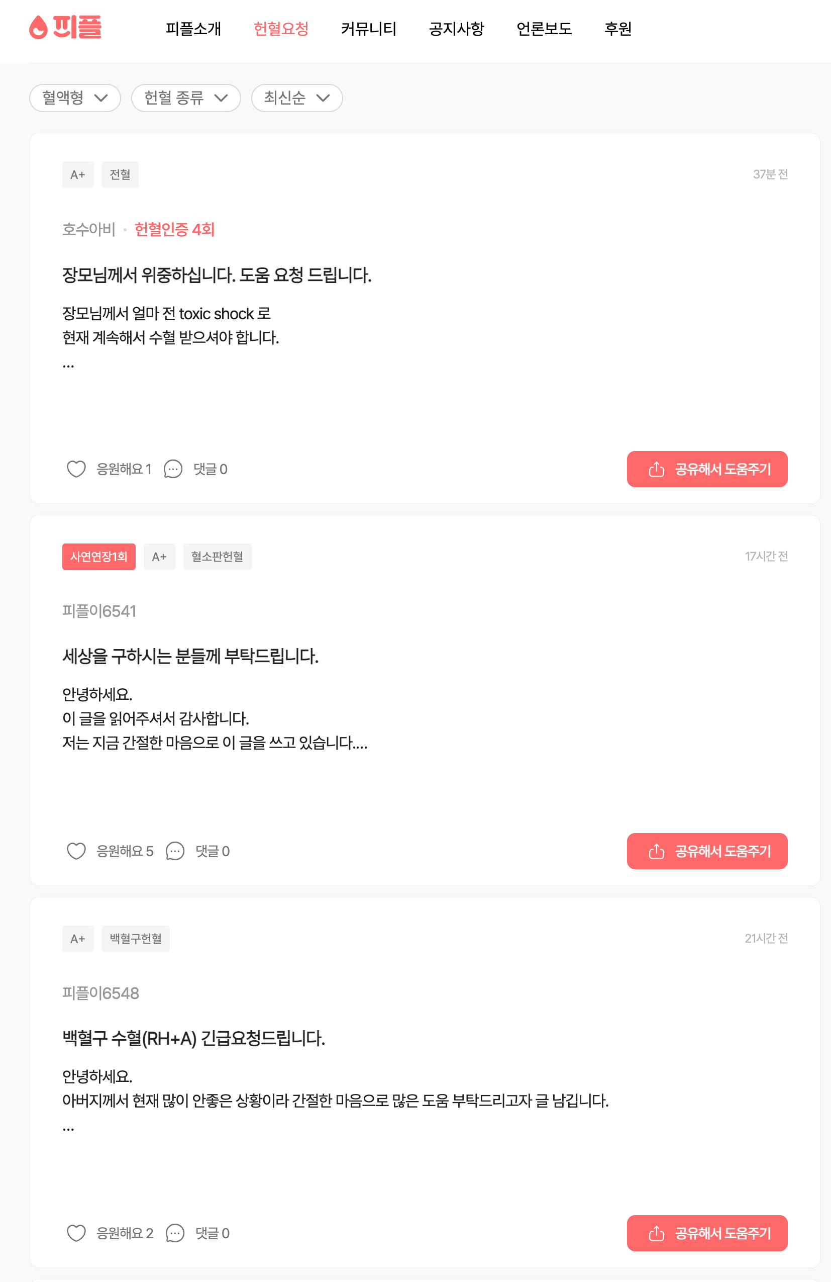 의료기관에 혈액이 있으면 수술이 가능하지만, 병원에서조차 피가 부족해 수술이 미뤄지고 있다는, 21세기 대한민국에서 일어날 수 없는 말도 안되는 현실을 바꿔보자! 라는 생각에, 대학교 3학년 친구들과 창업에 무작정 뛰어들었습니다. (운영중인 피플헌혈 서비스 : https://pple.link/ )
