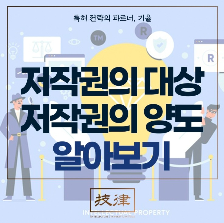저작권의 대상과 저작권 양도 방법 살펴 볼까요? 지식재산권의 한 영역인 저작권은 창작자들의 권리를 보장함으로써 지속적인 창작활동을 위한 동기를 부여하고 사회발전에 기여함을 목적으로 하는, 사람의 생각, 사상, 감정 등을 외부로 표현한 창작물에 대한 독점적 권리를 뜻합니다. 저작권의 종류와 보호기간 저작권을 갖는 창작물의 종류로는 어문저작물, 음악저작물, 영상저작물, 미술저작물, 사진저작물, 소프트웨어, 도형저작물, 연극저작물, 건축저작물 등이 있습니다. 우리나라에서 저작권은 창작자의 생존기간 동안은 물론 사후 70년간 보호되며 컴퓨터 프로그램의 경우는 공표된 다음연도부터 70년간 보호됩니다. 널리 알려지지 않은 예명이 표시된 일반 저작물의 경우는 공표된 날로부터 70년간 지속되며 업무상 저작물 역시 공표된 날로부터 70년간 보호됩니다. 저작권의 성립요건 저작권도 특허권과 마찬가지로 성립하기 위해서는 성립요건을 충족해야 합니다. 저작권의 성립요건은 아래와 같습니다. 첫째, 사상이나 감정을 표현해야 한다. 단순 사실 기록과 자연현상의 결과물은 저작물로 간주될 수 없습니다. 둘째, 창작성을 담고 있어야 한다. 시간과 노력이 투자되었다고 하더라도 창작성이 없으면 저작권이 될 수 없습니다. 셋째, 표현된 것이라야 한다. 인간의 사상과 감정을 유형의 매체로 표현해야 합니다. 저작권 대상에 해당되지 않는 저작물들 가장 처음에 말씀 드렸듯이 저작권 보호를 받는 창작물에는 어문, 음악, 연극, 미숙, 건축, 사진, 영상, 도형 저작물 및 컴퓨터 프로그램 등이 있습니다. 하지만 이 범위에 속하더라도 아래와 같은 경우는 저작권의 보호를 받을 수 없습니다. 1. 아이디어 저작권법은 ‘아이디어, 표현의 이분법’입니다. 즉 표현은 보호하되 아이디어는 보호하지 않고 자유롭게 이용이 가능합니다. 예를 들어 영화, 드라마 등의 기본적인 줄거리는 보호 대상이 아니고 미술저작물의 경우는 선, 색상, 형상 등이, 음악저작물에서는 리듬, 화성 등이, 컴퓨터프로그램의 경우는 알고리즘을 제외한 프로그램만이 저작권 보호를 받는 대상입니다. 2. 관공서에서 작성한 문서 공공성이 강한 관공 문서 역시 저작권의 보호를 받지 못하며 여기에는 헌법을 비롯하여 법률, 조약, 명령, 조례, 규칙 등과 법원의 판결, 결정, 국가 또는 지방단체의 저작물들이 포함됩니다. 3. 시사보도 저작권의 보호를 받는 저작물은 저작자의 감정, 사상을 표현한 것들이기 때문에 사실만을 전달하는 시사보도는 저작권의 보호 대상이 아닙니다. 그러나 일반적인 신문기사는 저작권을 지니고 있으니 참고하시기 바랍니다. 저작권의 양도 및 라이센스 계약 저작권의 양도는 영구적으로 권리를 넘기는 것이고 라이센스는 정해진 기간 동안 권리 행사를 허락해주는 것입니다. 라이센스에는 독점적 라이센스와 비독점적 라이센스가 있는데, 독점적 라이센스랑 허락을 받은 자가 저작권의 원래 소류자를 포함하여 모든 타인이 해당 창작물을 복제하지 못하도록 하는 것이며 비독점적 라이센스는 저작권의 원래 소유자가 저작권 자체를 보유하면서 일부 행사할 권리만을 주는 것입니다. 특허양도와 저작권 양도는 어떤 차이가 있을까요? 특허의 경우에는 특허품의 사용, 판매, 제작 모두를 특허권자 또는 허락을 받은 사람만이 할 수 있습니다. 저작권의 경우에는 창작물의 복제 혹은 복제라고 칭할 수 있는 유사 행위를 저작권자 및 허락받은 자만이 할 수 있습니다. 즉, 특허권자의 허락 없이 만들어진 발명품을 사용하는 것은 침해에 해당되지만, 저작권자의 허락 없이 창작물을 즐기는 것 자체는 침해 행위에 해당되지 않습니다. 올바른 지식재산권에 관한 정보를 전달하기 위해 노력하는 기율법률특허사무소에서 들려드리는 지식재산권 이야기! 다음 기율IP레터에서 더욱 더 유용한 이야기를 가지고 돌아 오도록 하겠습니다. 누구나 IP 똑똑이가 되어야 하는 시대! 기율IP레터로 지적재산권을 단단히 지켜냅시다 💪 기율IP레터 kiyul@kiyul.co.kr