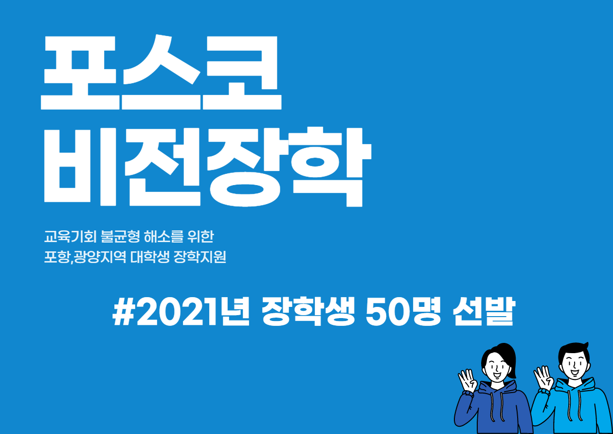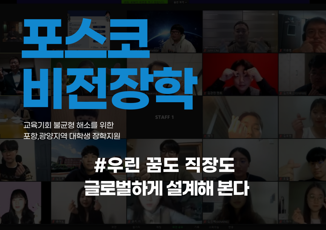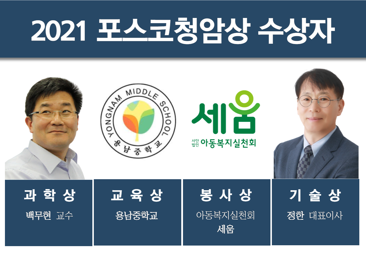 올해 포스코청암상 수상자로 과학상에 백무현 KAIST 화학과 교수, 교육상에 경남 사천 용남중학교, 봉사상에 사단법인 아동복지실천회 세움, 기술상에 정한 아이쓰리시스템㈜ 대표이사를 각각 선정했습니다. 2021 포스코비전장학생 50명 선발 올해 대학 입학이 예정되어있는 포항 광양지역 학생 50명 선발하고, 4년간 장학금을 수여합니다. 2006년 첫 선발 이래 현재까지 총 437명을 지원했습니다. 포스코비전장학 글로벌 취업멘토링, 꿈도 직장도 글로벌하게 설계해요! 글로벌 취업멘토링을 통해 장학생들이 진로를 잘 설계할 수 있도록 글로벌 기업 관련 정보를 제공하고, 다양한 직무 코칭을 진행하였습니다. 주소 : (06194) 서울특별시 강남구 테헤란로 440 포스코센터 서관 5층