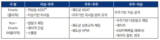 [ 우주자산에 대한 위협 구분 - 출처 : 우주자산 위협 양상과 주변국의 대응 정책 및 시사점, INSS ] |
