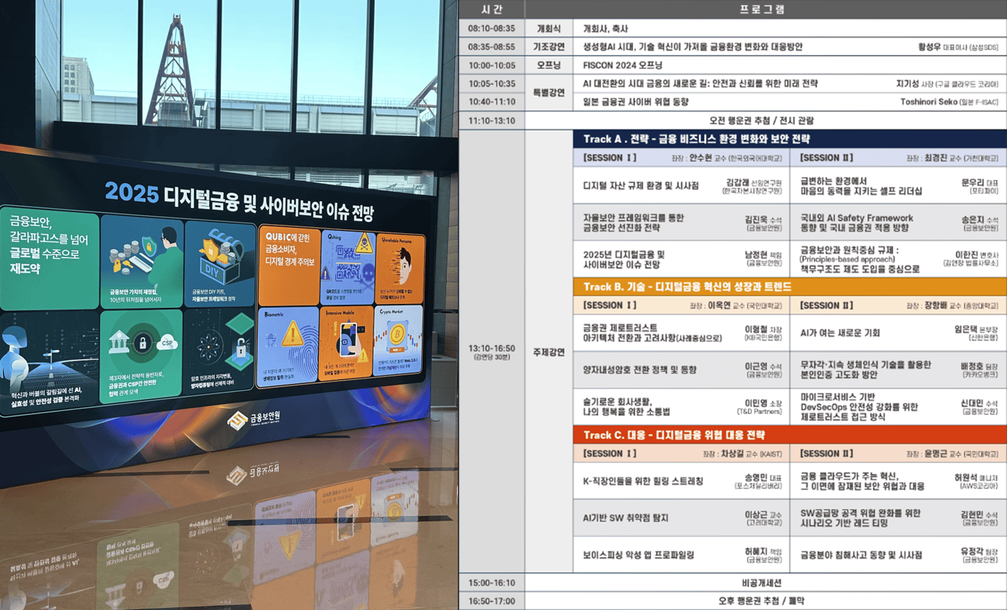 [ (좌) FISCON 현장 사진 - 출처 : 직접 촬영, (우) FISCON 세션 시간표 - 출처 : 금융보안원 ]
