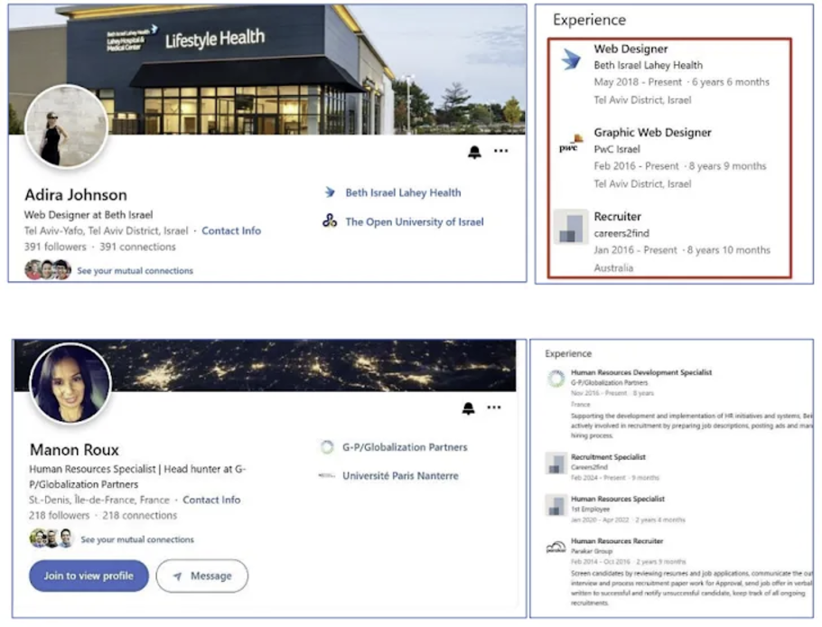보안업체 ClearSky에 따르면, TA455(별칭 Yellow Dev 13)는 인물 프로파일을 위해 AI로 생성된 다양한 사진을 사용하고, 실제 인물을 사칭하여 공격 활동을 수행했다고 밝혔다. 이들의 공격 수법은 북한 해킹 조직 Lazarus Group이 수행한 "드림잡 캠페인"과 유사한 부분이 존재하는 것이 특징이다. 특히 채용 기회를 미끼로 한 전술과 DLL 사이드로딩 기법을 통해 악성코드를 배포하는 점이 공통적으로 나타났다.