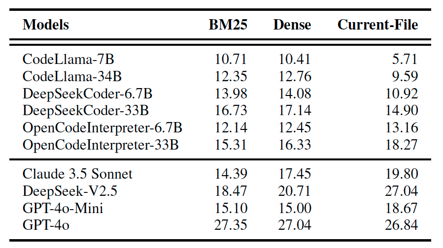 Even a high-performance model like GPT-4 achieved only a 27.35% pass@1 success rate on the REPOCOD dataset. While this is a demanding accuracy standard, the results starkly contrast with simpler coding tasks where models tend to score higher.