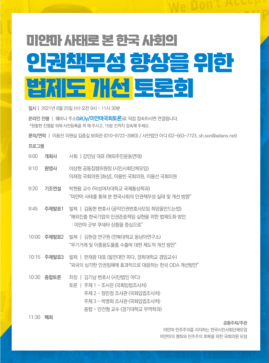 프로그램을 운영하는 데 많은 아이디어를 얻을 수 있었습니다. 아디 소식😃 ![]() 사단법인 아디는 지난 마을별 집단학살 보고서 30종을 종합하는 종합보고서 '그들은 우리가 무슬림이라서 그랬습니다'를 발간하였습니다. 영문판, 한글판으로 제작되었으며 아래 버튼을 통해 전문을 보실 수 있습니다. ![]() 경향신문 ["아이 둘 낳으면 징역형"... 우리는 '벵갈리 칼라'로 불렸다.] 로힝야 학살 4주기를 맞이하여 경향신문에서는 아디의 심층 인터뷰 인권기록에 대해 주목하여 기획기사를 작성하였습니다. 위 기사에는 실제 로힝야족 인권침해 증언과 로힝야족 학살 증언을 만나볼 수 있습니다. 또한 그들이 얼마나 뿌리깊은 차별을 견디며 살아왔는지에 대해서도 자세히 기술되어있습니다.(사진 조진섭) ![]() 경향신문[로힝야 학살 4년 끝나지 않는 비극 콕스바자르 난민촌의 삶] 쿠투팔롱 난민촌의 로힝야족은 어떻게 살고 있을까요? 경향신문은 로힝야족 난민촌의 현실을 생생하게 알리기 위해 사단법인 '아디'를 통해 쿠투팔롱 난민촌 주민들과 서면 인터뷰를 진행했습니다. 인터뷰에서 난민들은 "방글라데시에서도 이동의 자유, 교육받을 권리 등 인권이 보장되지 않기는 마찬가지"라고 입을 모았습니다. 방글라데시 당국은 2019년부터 안전상의 이유로 난민촌 외부와 내부 곳곳에 철조망을 쳤습니다. (사진 휴먼라이츠워치)![]() 연합뉴스 [미얀마 군 로힝야족을 체계적으로 파괴, 국내단체 첫 심층조사 ] 사단법인 아디는 미얀마 군경이 2017년 8월 마을에서 학살과 강간, 약탈을 조직적으로 자행했다는 로힝야족 주민들의 증언과 사진, 영상을 담은 '로힝야 집단학살 종합 보고서'를 24일 발표했습니다. 아디는 "현장 기록 조사자들이 2017~2020년 방글라데시 난민촌에 거주한 로힝야 생존자 845명을 심층 인터뷰 했다"고 했습니다. 보고서에 따르면 군경은 로힝야족을 총칼은 물론 폭행과 방화, 생매장 등 방식으로 살해했다. 생존자들은 아동, 노인, 장애인, 임신부도 목숨을 잃었고 군경이 시슨 수습을 막으며 훼손하기도 했다고 전했습니다. 집단 강간과 불법체포 증언도 나왔다. 이번 조사는 광주인권평화재단과 진실의힘의 지원으로 수행되었습니다.. 아디는 조사자료를 국제형사재판소(ICC)와 국제사법재판소(ICJ)에 제출할 예정입니다. ![]() 세계일보 [미얀마 군 집단학살 전부터 로힝야 족 파괴] 국내 인권단체 사단법인 아디는 24일 로힝야 집단학살 피해 주민들의 증언을 담은 '로힝야 집단학살 종합보고서'를 발표했습니다.. 2017~2020년 방글라데시 난민촌에 거주하는 로힝야족 생존자 845명을 인터뷰한 내용을 정리하는 것입니다. 이들 마을에 대한 조사는 세계 최초라는게 아디 측 설명입니다. 아디는 "미얀마 정부가 2017년 학살 작전 전부터 로힝야 사람들의 삶을 체계적으로 파괴했다"며 "2012년부터 종교, 이동, 결혼, 출산의 자유를 보장받지 못했고, 교육권, 건강권, 투표권, 노동권이 박탈됐다"고 설명했습니다. (사진 연합뉴스) ![]() [알쓸신잡 기록하다편 1탄 수강후기] 아디 알쓸신잡 기록하다편 1탄 수강생 이사랑님의 후기를 가져왔어요. 이사랑님은 아디의 알쓸신잡 기록하다편을 통해 어떤 것을 느끼셨을까요? 함께 살펴보아요 :) #알쓸신잡 #기록하다 #사단법인아디 수강 후기를 나눠주신 이사랑님 진심으로 감사드립니다. 미얀마 민주주의를 위한 아디의 연대활동 ![]() [미얀마 사태로 본 한국사회의 인권책무성 향상을 위한 법제도 개선 토론회] 사단법인 아디는 미얀마 민주주의를 지지하는 한국시민사회단체모임에 함께하며 미얀마 민주주의를 위한 다양한 연대활동을 펼치고 있습니다. 연대활동 중 하나로 국회 토론회를 준비하여 개최하였고, 인권책무성 향상을 위해 법제도를 어떻게 개선하면 좋을지에 관해 함께 토론하였습니다. ![]() [로힝야 학살 4주기 온라인 토크콘서트 : 미얀마 민주주의 기로에서 로힝야를 생각하다] 로힝야 4주기를 맞이하여 이야기 1. 현지 캠프의 상황, 방글라데시 로힝야 난민 , 이야기 2. 4년의 집단학살 진상조사의 시사점 , 이야기 3 미얀마 민주항쟁 이후 변화된 인식과 성찰 이라는 주제로 온라인 토크콘스터를 열었습니다. 위 토크 콘서트를 통해 로힝야 4주기를 함께 추모하고 미얀마가 민주주의를 되찾고, 로힝야 족과도 함께 공존하는 사회로서 존재할 수 있기를 기원하였습니다. 사단법인 아디 |