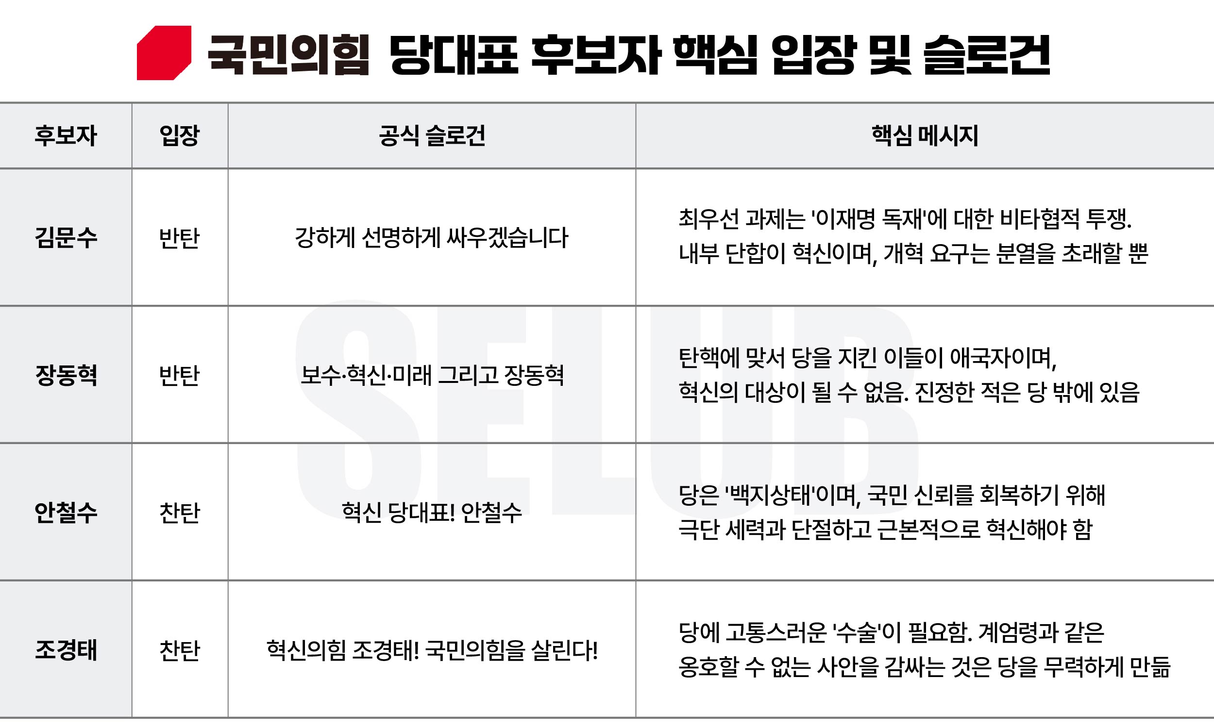 - '๋ฐํ'์ ๋ฐ์: ๊น๋ฌธ์, ์ฅ๋ํ ํ๋ณด๋ "๋ด๋ถ ์ธ์ฌ์๊ฒ ์ด๊ตฌ๋ฅผ ๊ฒจ๋ ์ ์ ๋๋ค"๋ฉฐ ๋จํฉ์ ๊ฐ์กฐํ๋ ๋ฏธ์จ์ ํ๋๋ฅผ ๋ณด์๋ค. ์ด๋ ๊ฐ์ฑ ์ง์ง์ธต์ ์์ฒญํ์ง ์๊ฒ ๋ค๋ ๋ช