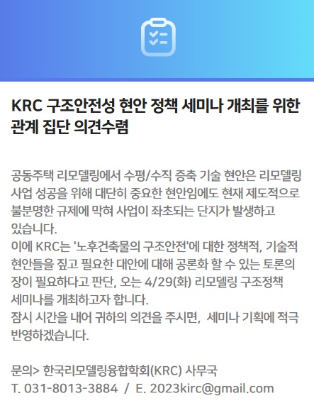 이에 KRC는 4월말, 노후건축물의 구조안전'에 대한 정책적, 기술적 현안들을 짚고 필요한 대안에 대해 공론화 할 수 있는 토론의 장(KRC 구조정책세미나)을 준비하고 있습니다. 곧 프로그램을 소개해 올릴 예정입니다. 많은 기대와 참여 부탁드려요!
