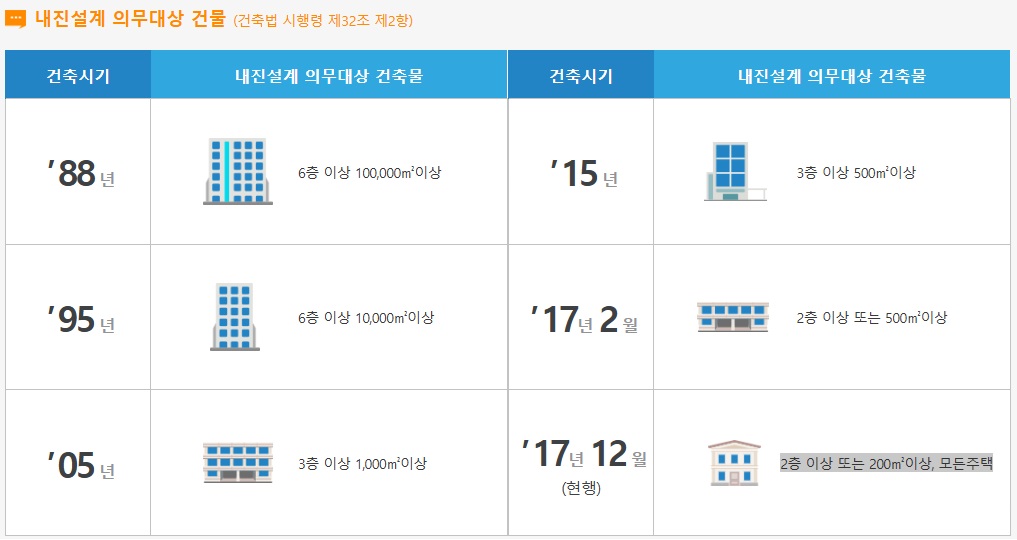 우리나라의 지진 발생 빈도 또한 매년 증가하는 추세이며, 강진 사례도 등장해 더이상 우리나라가 지진 안전지대가 아니라는 인식이 생겨나고 있어요. 건축법이 내진 설계를 의무화 한 건 1998년이지만, 대상 건물이 6층 이상 혹은 연면적 10만㎡이상으로 규정돼, 주거용 건물 대부분이 내진 대상에서 빠져있었죠. (2017년 11월 발생한 진도 5.4 포항지진 이후 2층 이상 또는 200㎡이상, 모든주택이 내진설계 의무대상으로 지정됐어요). 당시 기사에 의하면, 전국 '내진설계 대상' 건축물 274만여 개 중 내진설계 성능이 확보된 곳은 56만여개로 20%에 불과하고, 서울지역 대상건축물 가운데 27.5%만이 내진 기능을 갖추었다고 해요.