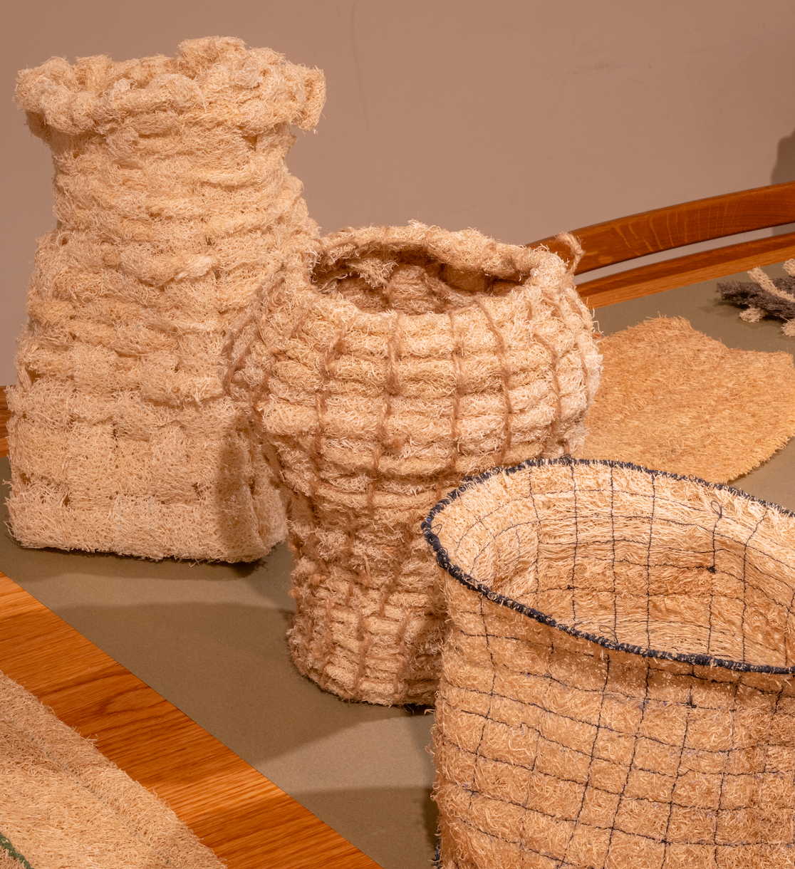 예지님은 수세미의 물과 만났을 때 유연하게 부풀어 오르는 점에 흥미를 느꼈다. 스펀지처럼 수세미의 거친 텍스처가 부드러워질 거라 예상하지 못했는데 그 반전이 재밌었다. 소재를 다루는 방식과 툴은 텍스타일에서 차용해 다양한 실험을 하고 있다. 수세미는 마치 원단처럼 표현할 수 있는 범위가 넓다. 짜임으로 엮거나 땋아서 패턴을 만들 수 있고, 형태를 잡으면 바스켓이나 조명 갓과 같은 조형물이 된다. 요즘은 등나무 같은 타 재료와 수세미를 결합해 수세미의 더 넓은 가능성을 탐구하고 있다. |