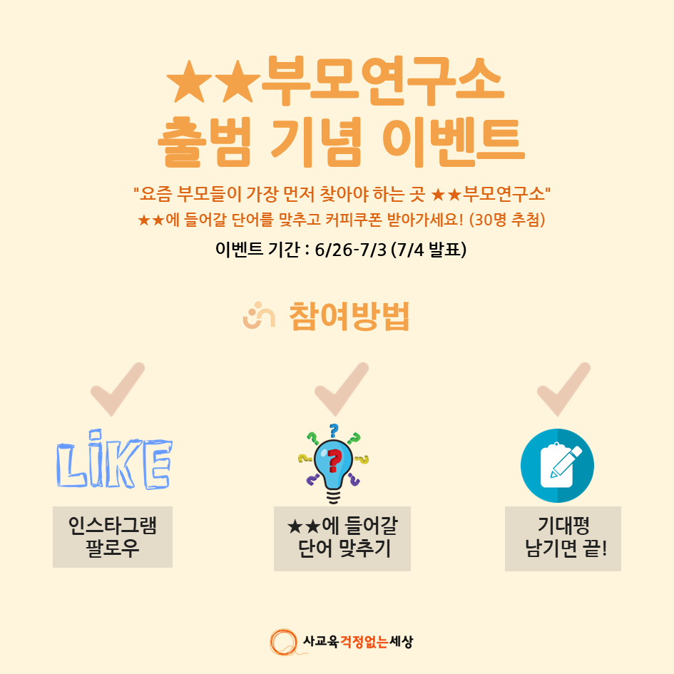 요즘 부모들이 가장 많이 찾아야 하는 곳 ‘★★부모연구소’ 6/28(목) 오전 10:30 출범식을 열고 새롭게 출발했습니다. ‘★★부모연구소’는 자녀교육의 고민과 노하우, 연결과 위로를 나누며 해결책도 함께 찾아보려 하는데요! 더 많은 분이 연구소를 아셨으면 하는 마음을 담아 ‘인스타그램 이벤트’를 준비했습니다.