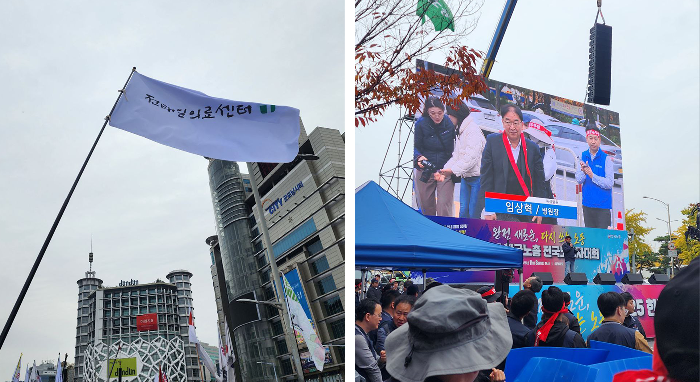 11월 13일은 전태일 열사가 “우리는 기계가 아니다”, “근로기준법을 준수하라” 외침과 함께 세상을 떠난 날입니다. 전태일 열사의 마음을 잊지 않기 위해, 그리고 오늘의 노동 현실을 다시 바라보기 위해 매년 이 시기 노동자들은 서로의 손을 맞잡고 거리로 나옵니다. 지난 11월 8일(토), 전태일의료센터도 처음으로 깃발을 들고 노동자대회에 함께했습니다. 민주노총은 동대문역사문화공원역 인근에서 “모든 노동자의 노동기본권 쟁취”를 외쳤고, 노동자 안전을 위한 작업중지권 보장을 요구하며, 장기간 고공농성 중인 세종호텔 고진수 지부장에게로 행진했습니다. 여의도에서는 한국노총이 “5인 미만 사업장 근로기준법 전면 적용”, ‘정년 연장’, ‘4.5일제 실현’ 등의 요구를 내걸고 집회를 열었습니다. 노동자들의 삶을 바꾸고 싶은 소망이 적힌 피켓들이 곳곳에서 눈에 띄었습니다. 집회에서는 전태일 열사가 꿈꾸었던, 일하는 사람이 안전하게 노동하고 사람답게 살아가는 세상을 모두 함께 외치고 있었습니다. 앞으로도 전태일의료센터는 노동자의 삶 곁에서, 더 안전하고 더 따뜻한 사회를 만들기 위한 연대의 마음을 잊지 않겠습니다.