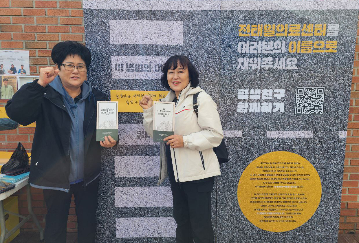 10월 29일, 전태일의료센터 건립위원회 사무실에 이태원참사로 딸을 잃은 고 신애진 님의 부모님이 방문하셨습니다. 쉽지 않은 걸음이었음에도 두 분은 전태일의료센터와 마음상담소의 취지에 깊이 공감하며 따뜻한 대화를 나누어 주셨습니다. 고인의 아버지 신정섭 님은 참사 이후 새벽마다 1년간 일기를 쓰며 마음을 붙잡았고, 이를 수필로 고쳐 책 <특별한 날은 특별히 아프다>로 펴냈다고 전했습니다. “부끄럽지만 전해야 한다는 마음으로 책을 냈다”고 말씀하셨습니다. 두 분은 10.29 이태원참사 피해자 지원을 위한 생활지원금을 기부하며, 마음상담소가 청년·노동자·재난·참사 피해자들에게 힘이 되는 공간이 되길 바랐습니다. “상담만으로는 회복이 어렵습니다. 편하게 머물 수 있는 공간이 필요해요.” 부모님은 애진 님의 친구들과 생존 청년들 가운데 지금도 고통을 말하지 못한 채 지내는 이들이 많다고 전했습니다. 아버님은 “참사의 가장 큰 문제는 드러나지 못한 피해자들”이라고 강조했고, 어머님은 상담뿐 아니라 편히 머물며 회복할 수 있는 공간의 필요성을 이야기하셨습니다. 전태일의료센터와 마음상담소가 그분들이 잠시 쉬어갈 수 있는 안전한 공간이 되길 함께 바라보았습니다. |