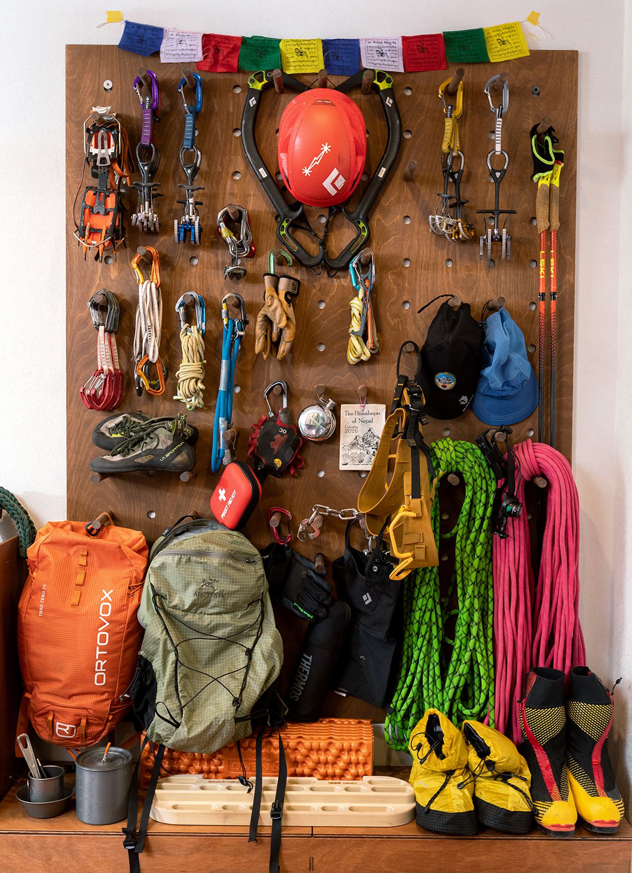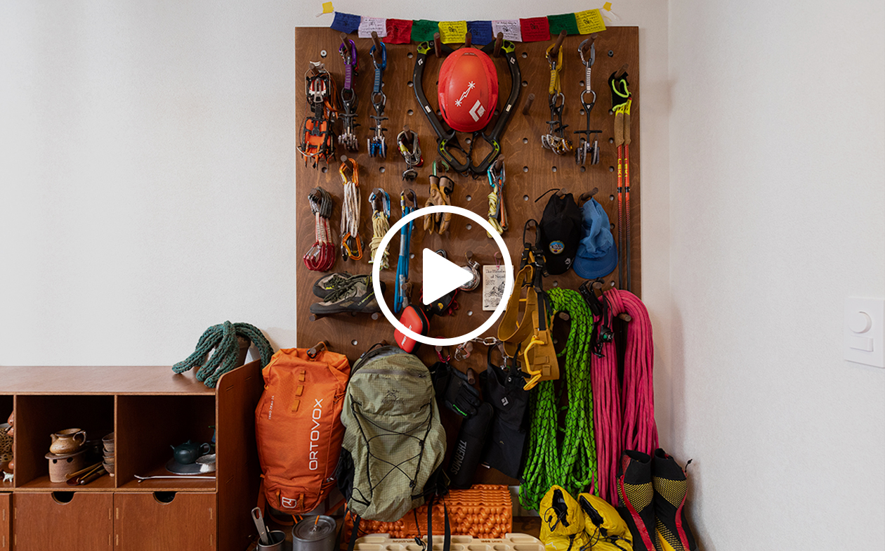 🖌️ 혜진 님의 특별한 구석은 어디인가요? 👩🏻 이 집의 정체성을 가장 잘 보여주는 공간은 거실이에요. 제가 사랑하는 아웃도어 장비들이 수납되어 있고, 집에서 대부분의 활동이 이곳에서 이루어지거든요. 그중에서도 가장 특별한 구석은 클라이밍 장비를 모아둔 ‘기어 랙(Gear Rack)’입니다. 오픈형 선반 형태로, 아이스 클라이밍과 트래드 클라이밍처럼 종목에 따라 달라지는 장비들을 한눈에 볼 수 있도록 정리해 두었어요. 활동 특성상 장비를 빠르게 챙겨야 할 때 특히 유용하죠. 이런 형태의 수납장은 클라이머들의 로망이기도 해요. 그래서 이번 인테리어에서 꽤 공을 들여 마련한 공간입니다. |