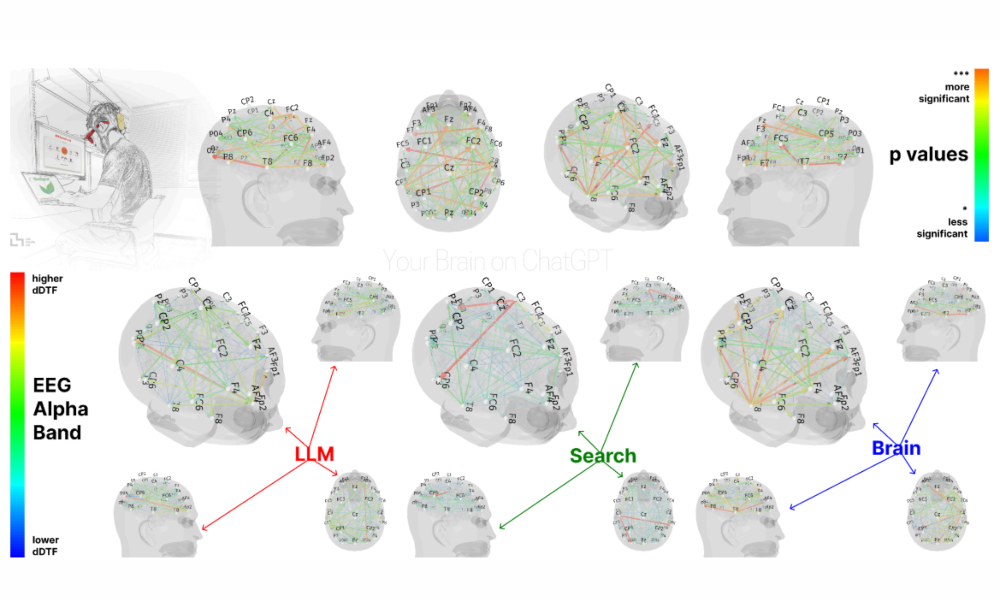 AI가 두뇌에 미치는 영향: 빨간색(LLM)은 AI와 대화할 때의 뇌 연결 모습이고, 초록색(Search)은 검색엔진을 쓸 때, 파란색(Brain)은 아무 도구 없이 생각만 할 때 모습이다. 두뇌 안의 선은 후두엽과 두정엽에서 주로 나타나는 알파밴드로, 빨간색에 가까울수록 활동이 강해졌다는 뜻이다.