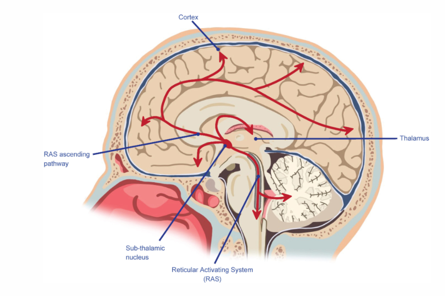 망상활성계(Reticular Activating System, RAS): 망상활성계는 뇌를 깨우는 스위치로, 뇌간에 위치한 신경망이다. 외부 자극을 감지하면 이를 상행경로(RAS ascending pathway)를 통해 정보 분배 센터인 시상(Thalamus)으로 전달한다. 시상은 다시 대뇌피질(Cortex)로 보내 뇌 전체의 각성 수준을 높여 집중력을 높인다.