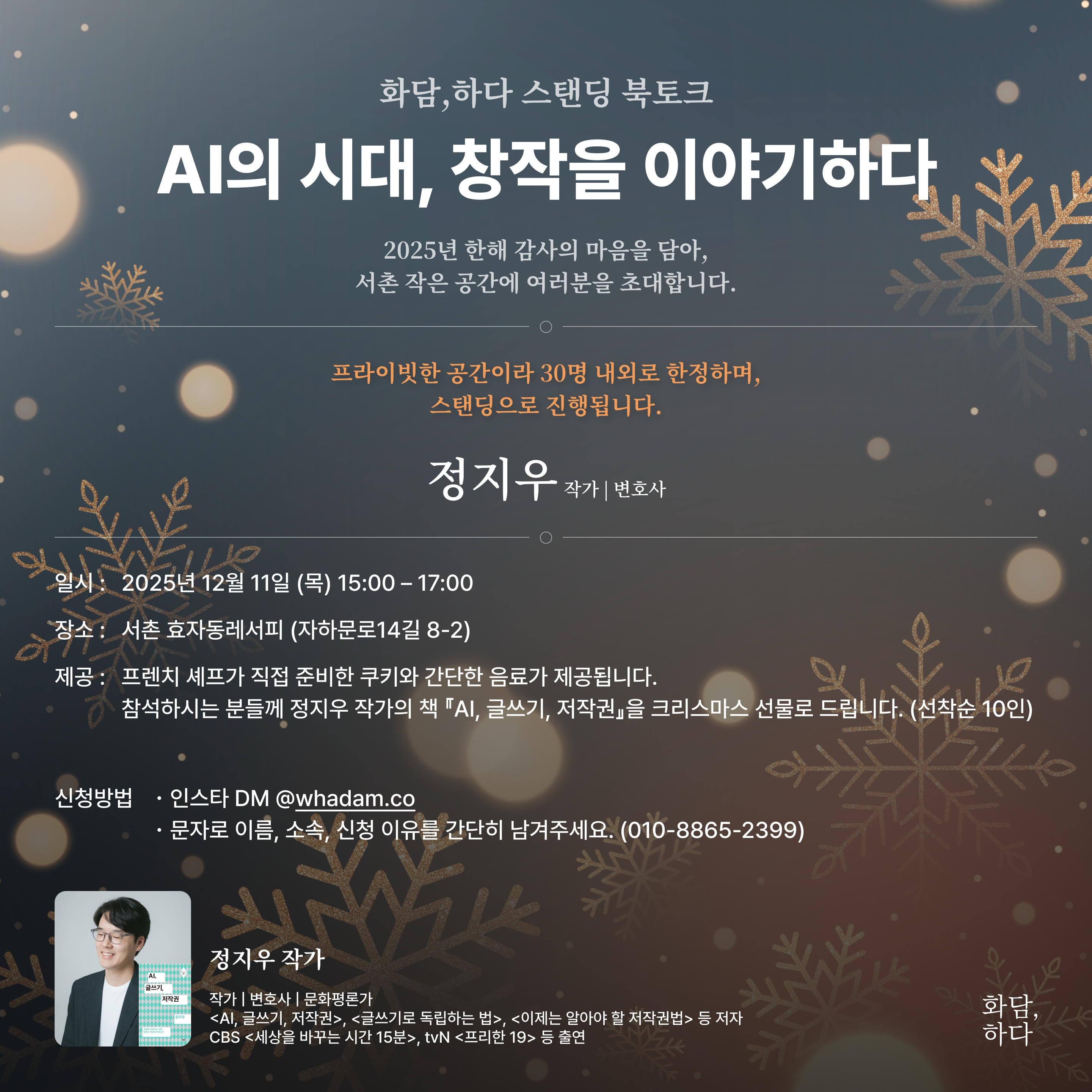 어느새 연말이 되어 송년 인사를 드리게 되었습니다. 어떤 한 해를 보내셨는지요? 화담,하다의 2025년은 특별히 감사할 일이 많았습니다. 그리고 그 시간 뒤에 많은 분들의 조언과 격려가 있었다고 믿고 있습니다. 화담,하다를 응원해 주시는 분들께 이 마음을 전하고자, 서촌의 작은 공간에 연말 스탠딩 북토크를 마련했습니다. 연사는 정지우 작가 겸 변호사이며, 주제는 <AI의 시대, 창작을 이야기하다>입니다. '매일 글쓰는 사람'으로 자신을 소개하는 정지우 작가는 세대를 아우르는 섬세한 감성으로 많은 분들께 사랑받는 작가입니다.