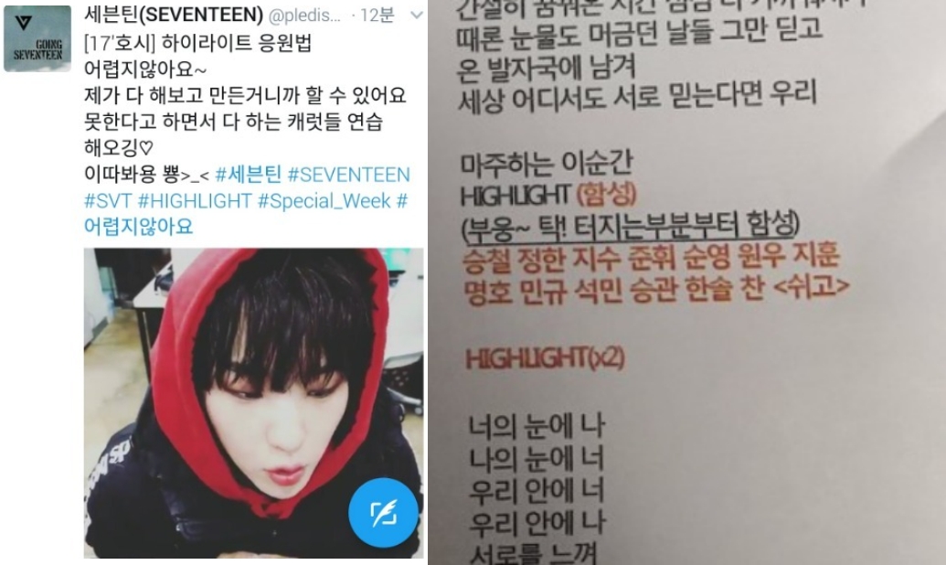 세븐틴은 일단 멤버만 13명이라 이름을 부르는 응원법만 해도 숨이 찬 응원법이 되어버리죠! 특히 초고난이도로 유명했던 곡은 ‘하이라이트’인데요! 5초 남짓한 시간 안에 13명의 이름을 연달아 외쳐야 하는 사실상 랩이었죠!! 멤버 호시는 SNS를 통해 직접 ‘하나도 어렵지 않아요~’라며 도전 의식을 자극했죠~ |