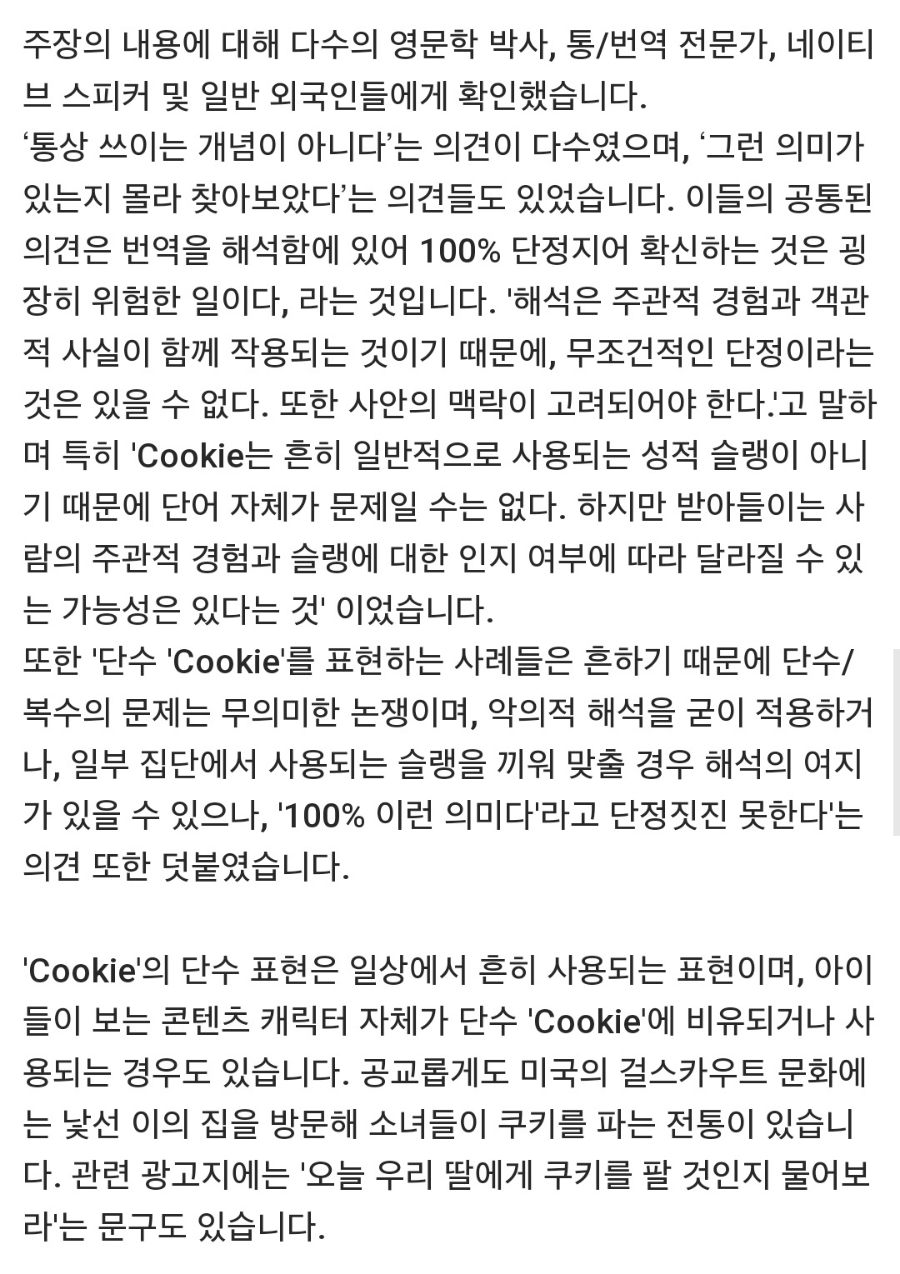 'Cookie'라는 단어 하나에 꽂힌 지적이 아니었다. '내가 만든 쿠키 너무 부드러우니 자꾸만 떠오르니' '내가 만든 쿠키 Come and take a lookie 우리 집에만 있지 놀러 와' 등 '쿠키' 가사의 전체적인 맥락을 봐도 성적 뉘앙스를 풍긴다는 주장이었다