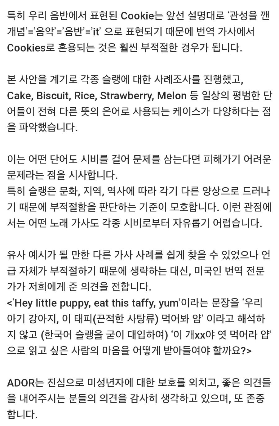어도어는 약 30매에 달하는 입장문을 냈다. 긴 입장문을 요약하며 전 세계의 슬랭(속어, 은어)은 모두가 알고 익혀야 하는 표준어가 아니라는 것. 가사엔 문제가 없고, 우리는 잘못한 게 없지만 해석이 잘못됐다는 입장이었다.