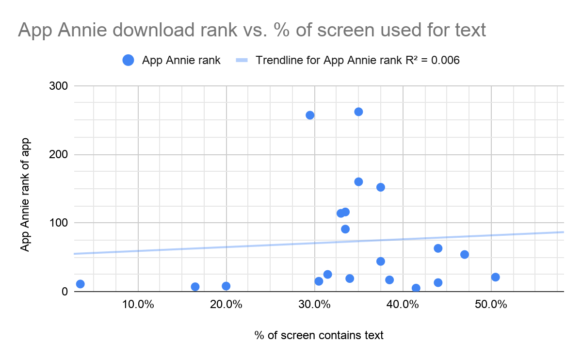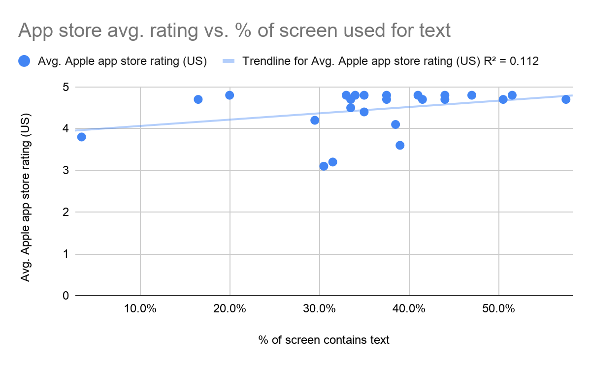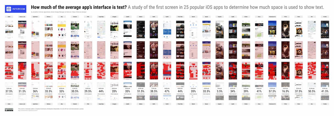 ์คํธ์ ์์ด ์ผ๋งํผ์ธ์ง๊ฐ ๋ ๊ถ๊ธํ๋ค. 2. ๊ฒฐ๊ณผ ๊ณ์ฐ ๋๋ถ๋ถ์ iOS ์ฑ์์ ์์ ํ๋ฉด์ 36% ์์ญ์ ํ ์คํธ๋ฅผ ๋ ธ์ถํ๋ ๋ฐ ์ฌ์ฉํ๊ณ ์์์ ํ์ธํ๋ค. Snapchat์ ๊ฒฝ์ฐ 3.5% Ticketmaster์ ๊ฒฝ์ฐ 57.5%๋ก ๋ํ๋ฌ์ง๋ง, ๋ง์ ์ ํ๋ฆฌ์ผ์ด์ ์ด 30%์์ 40% ์ฌ์ด์ ์ง์ค๋์ด ์์๋ค. ์ ์ผ ๋ง์ ์์ ํ ์คํธ๋ฅผ ๋ ธ์ถํ๋ ์์ ๋ญํน์๋ Uber(50.5%), Paypal(47%), Google Map(44%) ๋ฑ์ด ์๋ค. ์ด ๋ชจ๋ ์ฑ์ ์ดํด๋ณด๋ฉด, ํ