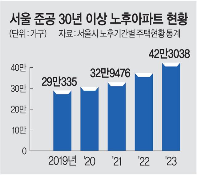 서울에서 서른 살을 훌쩍 넘긴 노후 아파트가 5년간 45%나 급증했다고 해요. 4가구 중 1가구 이상이 리모델링 연한(15년)은 물론, 재건축 연한(30년)을 넘긴 셈이죠. 1기신도시를 포함하면 그 숫자는 기하급수적으로 늘어나겠죠?