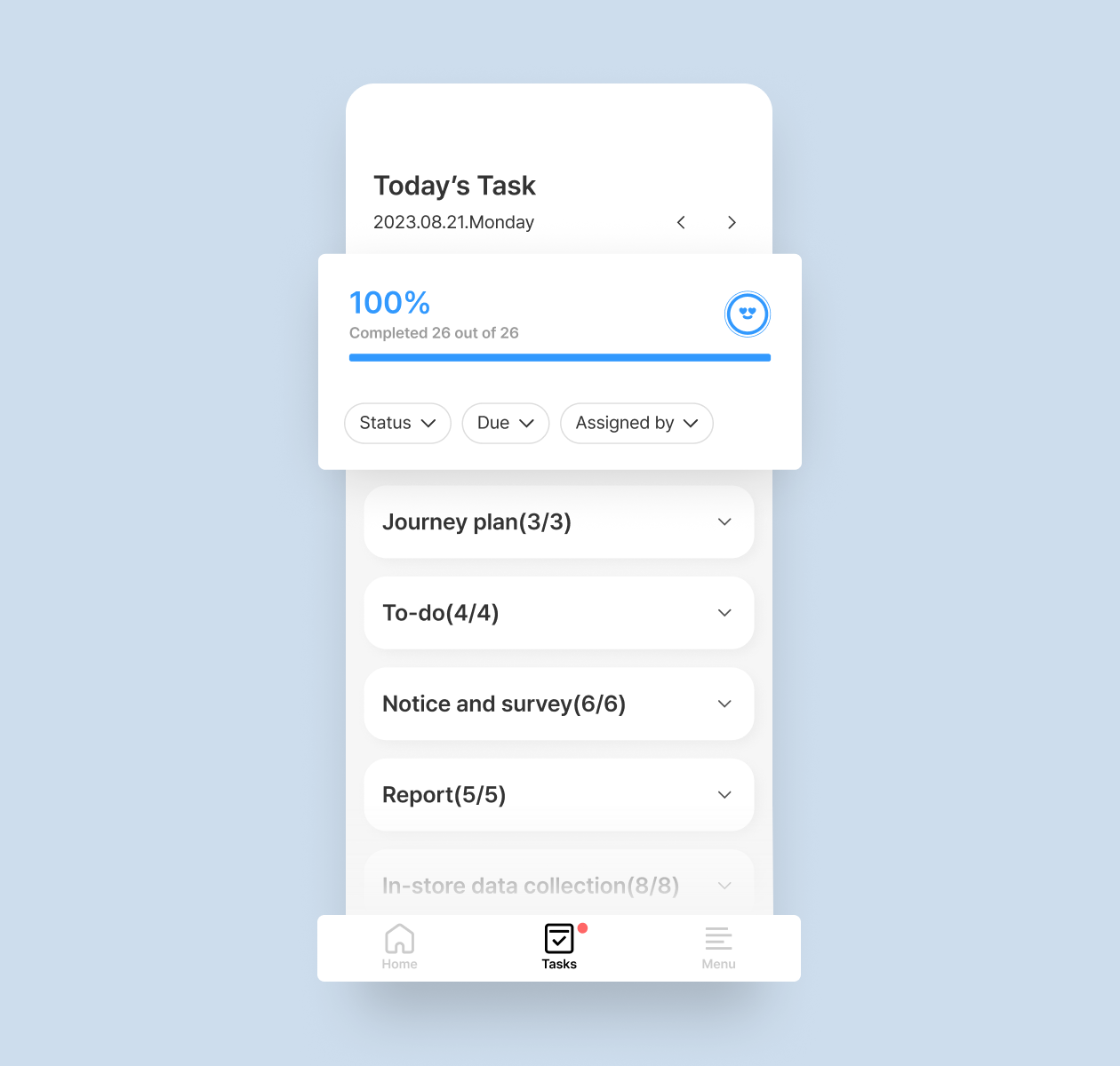 Press the 'Tasks' tab at the bottom of the screen and check today's tasks. Easily check the task completion rate and incomplete tasks as well.