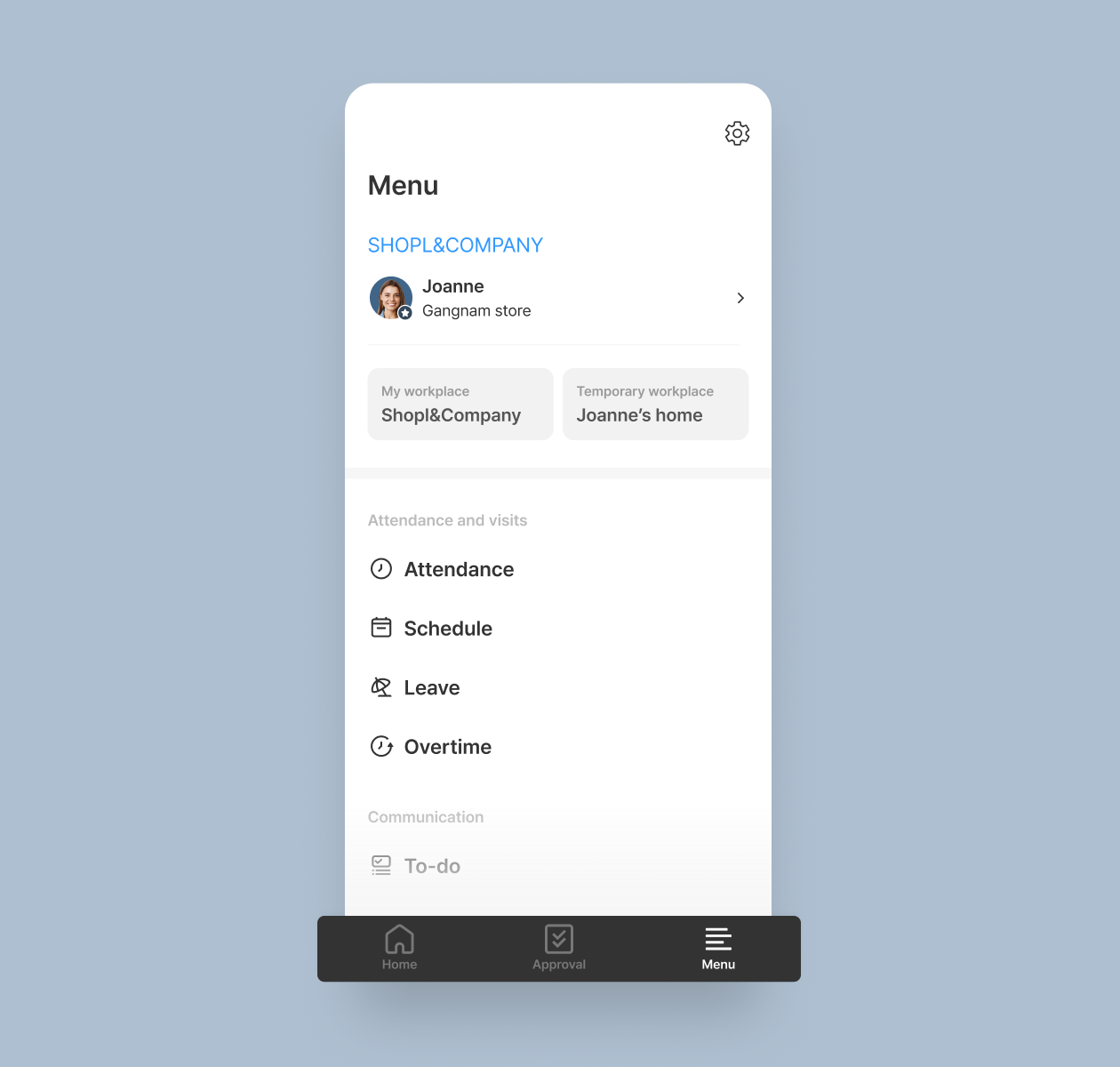 New main screen for the employee mode on the app! Go to frequently or recently used features right away, and check your schedule for the day. The punch in/out button will be on the blue card.