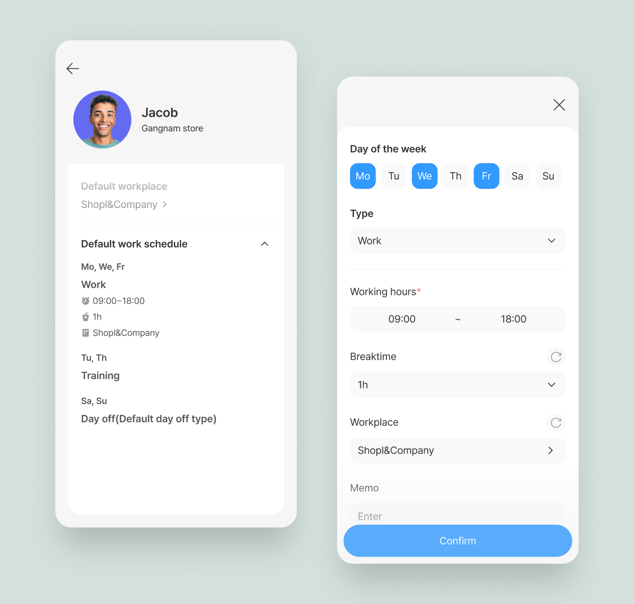 Set default work schedules for each day of the week. This function comes in handy when members have different fixed work schedules by day of the week. * Members > Add a member or Edit member info