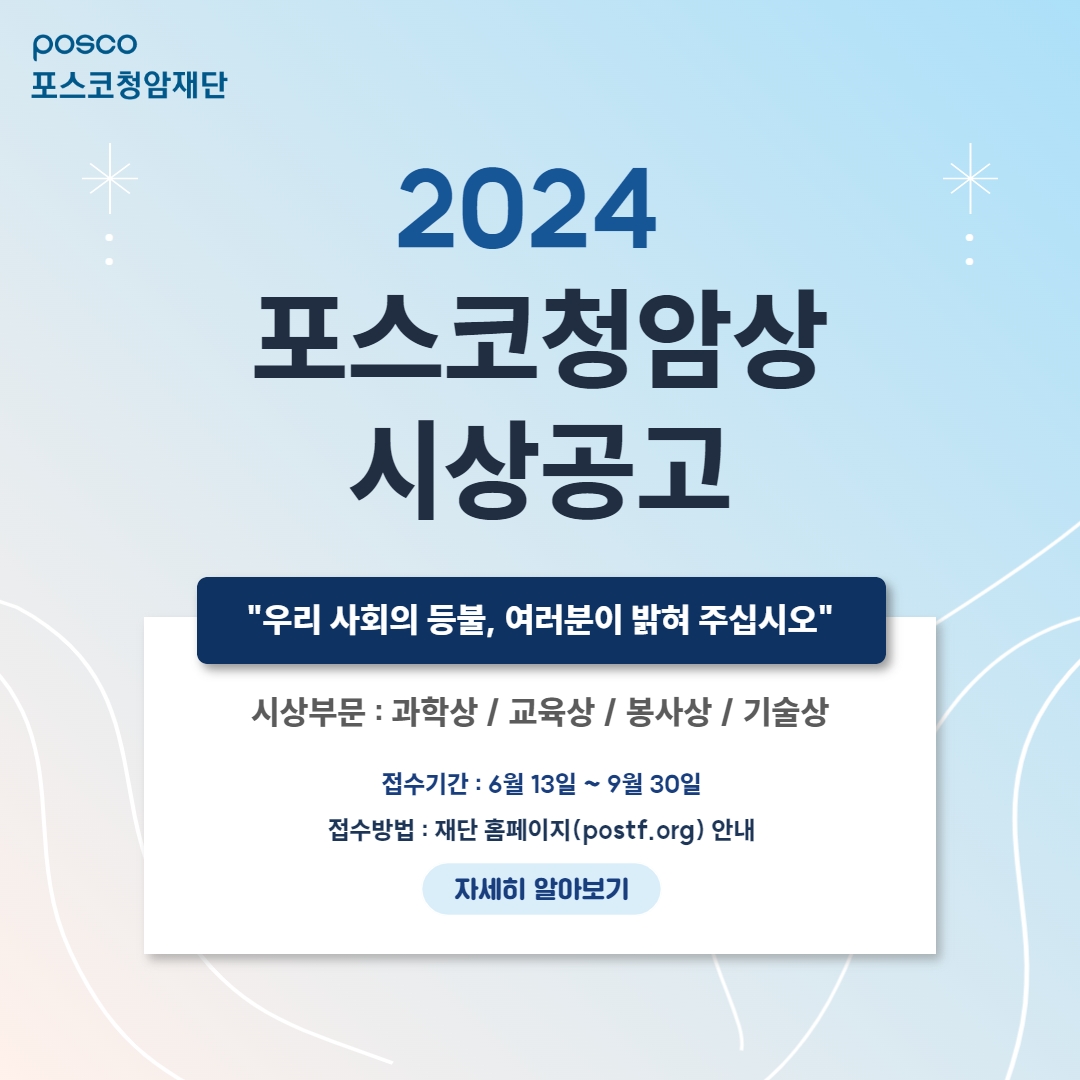 우리 사회의 등불이 되어 줄 ‘2024 포스코청암상’ 수상자 후보를 추천해 주십시오.