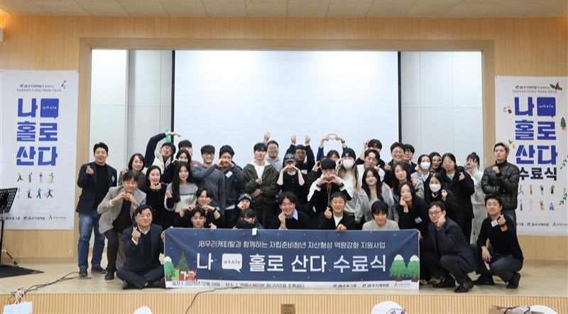 지난 12월 19일, 자립준비청년 자산형성 역량강화 지원사업 '나 홀(whole)로 산다' 수료식이 진행되었습니다. JB우리캐피탈의 후원으로 진행된 이번 프로그램은, 자산 형성과 자립 역량 강화를 목표로 하며 2년 차를 맞았습니다. 금융교육, 일대일 재무 컨설팅, 멘토링, 자산형성 지원금 지급 등 청년들의 안정적인 자립을 돕기 위한 다양한 프로그램으로 구성되어 있습니다. 수료식 토크콘서트에서 한 청년은 "첫해에는 자산 형성하는 방법을 배우고 코칭을 받으면서 그동안 가지고 있던 빚을 갚을 수 있었다"라며 "올해는 저축을 통해 현재의 불안정한 일자리를 넘어 새로운 미래를 꿈꾸게 됐다"고 소감을 밝혀 주었습니다. 단순한 교육 프로그램, 멘토링을 넘어 관계를 쌓고, 각자 상황에 맞는 솔루션을 찾는 유익한 시간이었습니다. |
